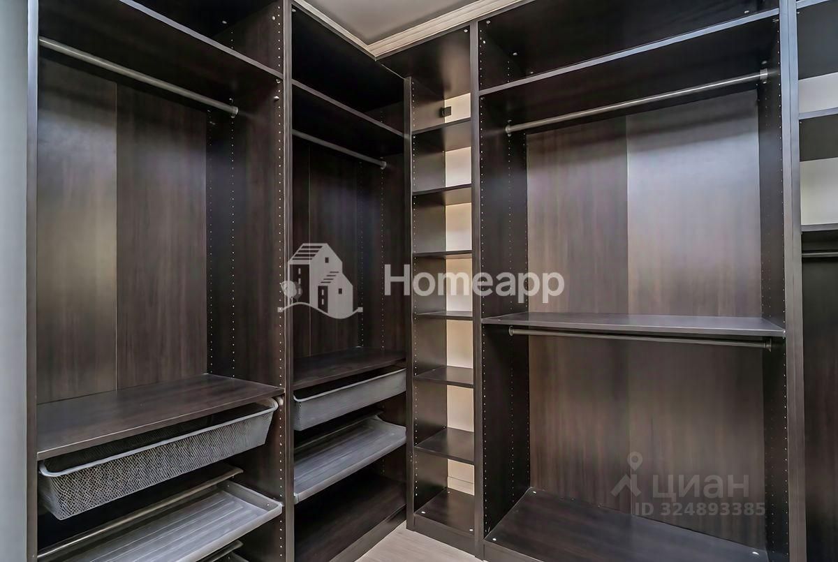 Продуманное Хранение: Предусмотрена вместительная, полноценно оборудованная гардеробная с темными полками и выдвижными корзинами, что полностью решает вопрос хранения вещей.