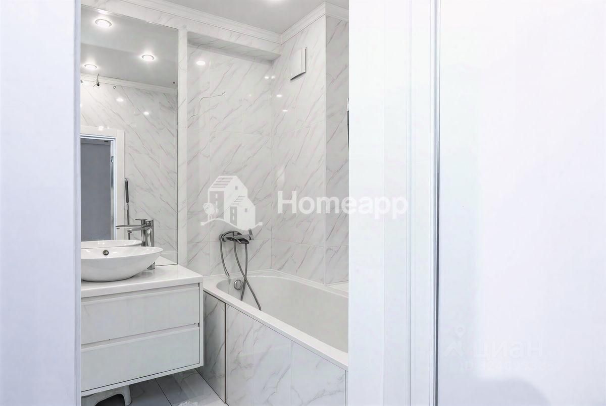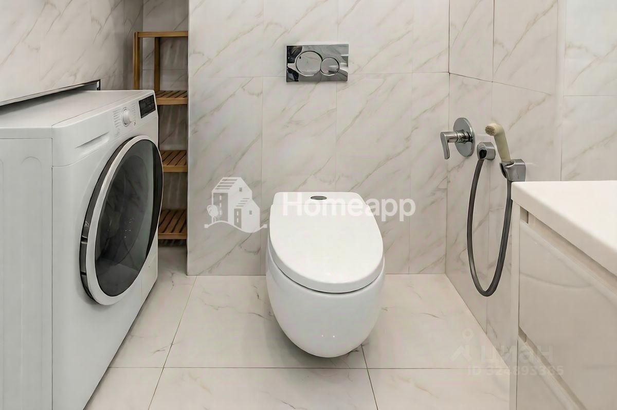 Ванная Комната: Отделана широкоформатным керамогранитом под мрамор. Установлена современная сантехника, включая подвесной унитаз, гигиенический душ и вместительную тумбу с накладной раковиной.