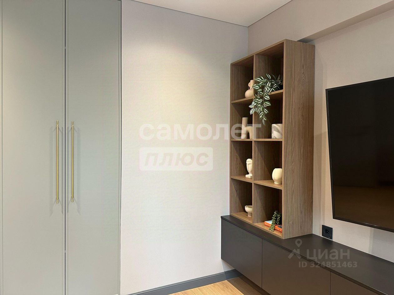 Общая площадь квартиры 55,7 м2: гостиная 14,7 м2, спальня 18 м2 + гардеробная 4 м2, кухня 7 м2, санузел раздельный, застекленный балкон из зала.