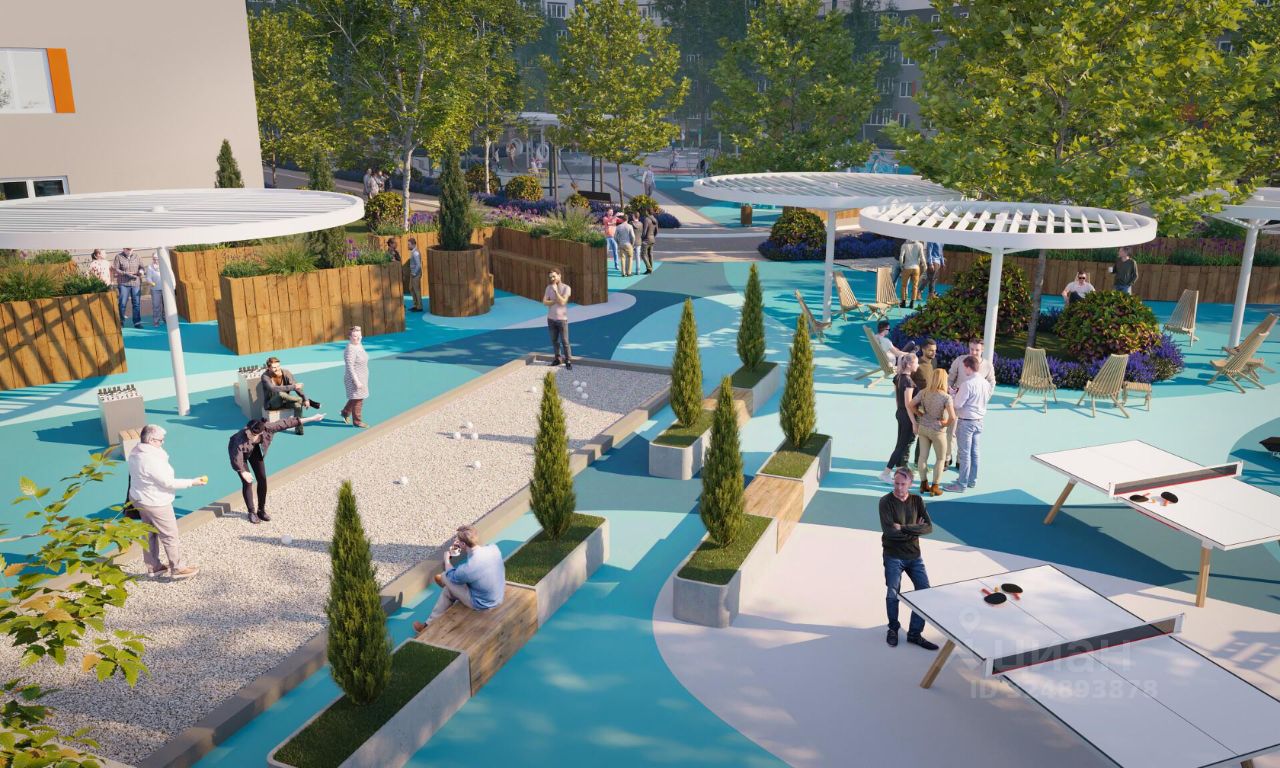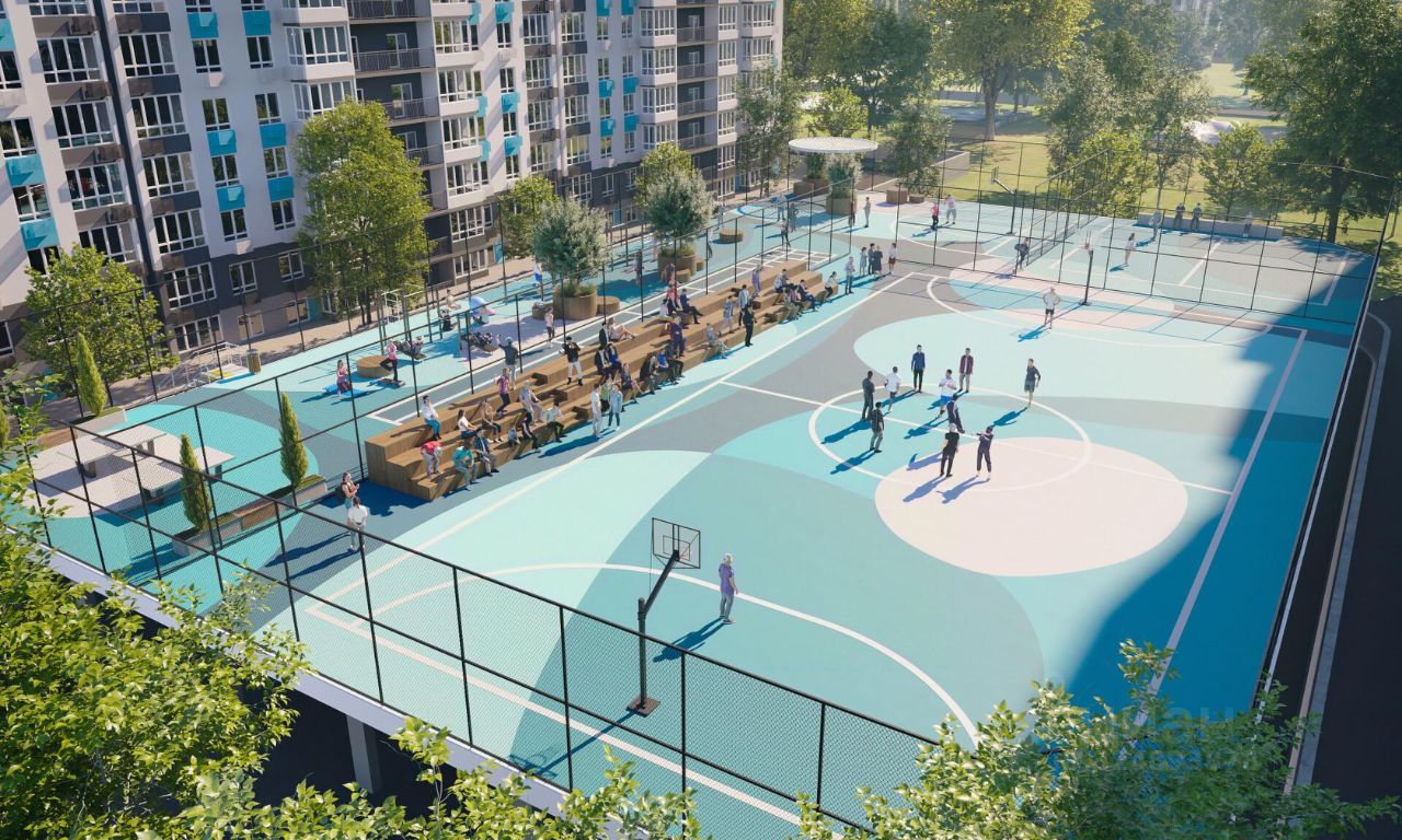 Двор комплекса закрыт от автомобилей и случайных прохожих. Для автовладельцев предусмотрен двухуровневый подземный паркинг на 650 мест. По всему периметру двора размещены видеокамеры. Внутренний двор благоустроен: предусмотрены пешеходные дорожки, скамейки и деревянные мини-беседки с розетками. Также спроектированы детские игровые площадки, уличные тренажеры и спортивная площадка для командных игр.