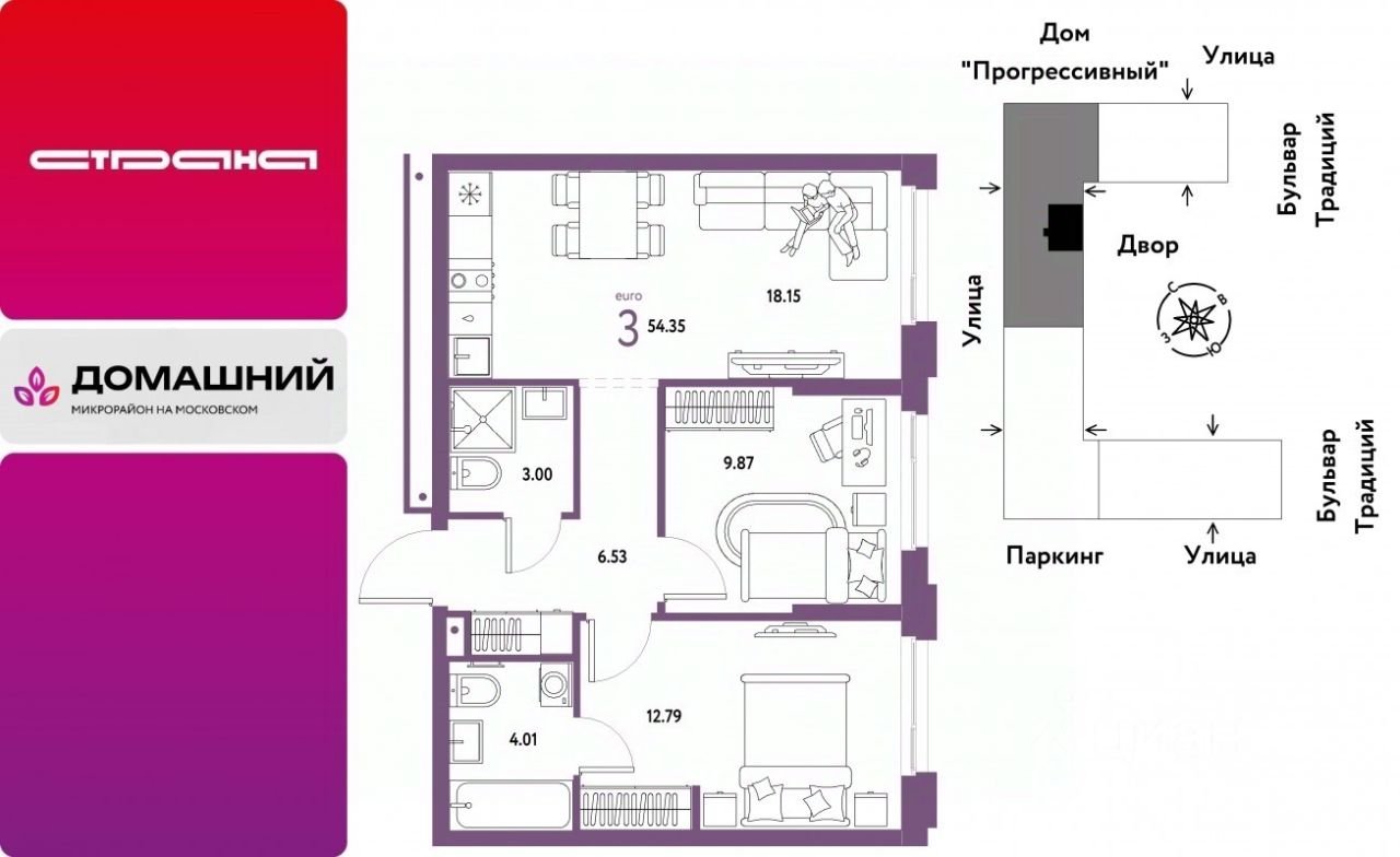 Продается 3комнатная квартира на 12 этаже от застройщика Страна Девелопмент. Площадь квартиры 54,35 кв. м.