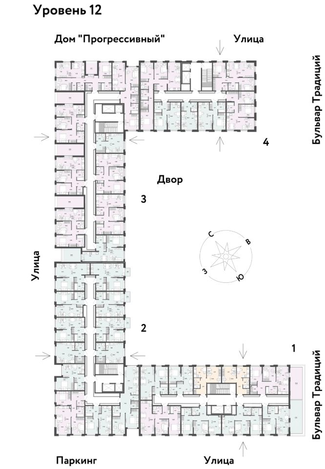 ПРЕИМУЩЕСТВА -Школа, зеленый сквер и пешеходный бульвар прямо внутри квартала -Закрытые дворы у каждого дома для активного и спокойного отдыха -Охрана, видеонаблюдение 24/7 и доступ к камерам в мобильном приложении -Сквозные парадные с прозрачными входными группами, колясочными и велосипедными -Паркинг с въездом по считыванию номеров, системой контроля выбросов CO2, тележками для покупок и велопарковкой -Торговая галерея на первом этаже дома