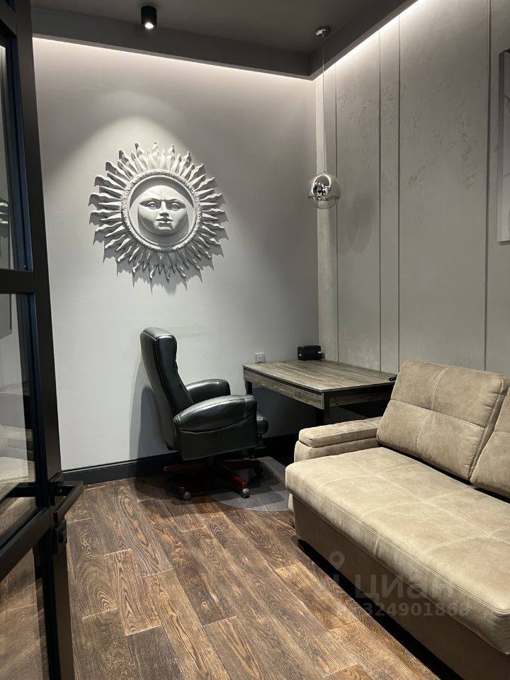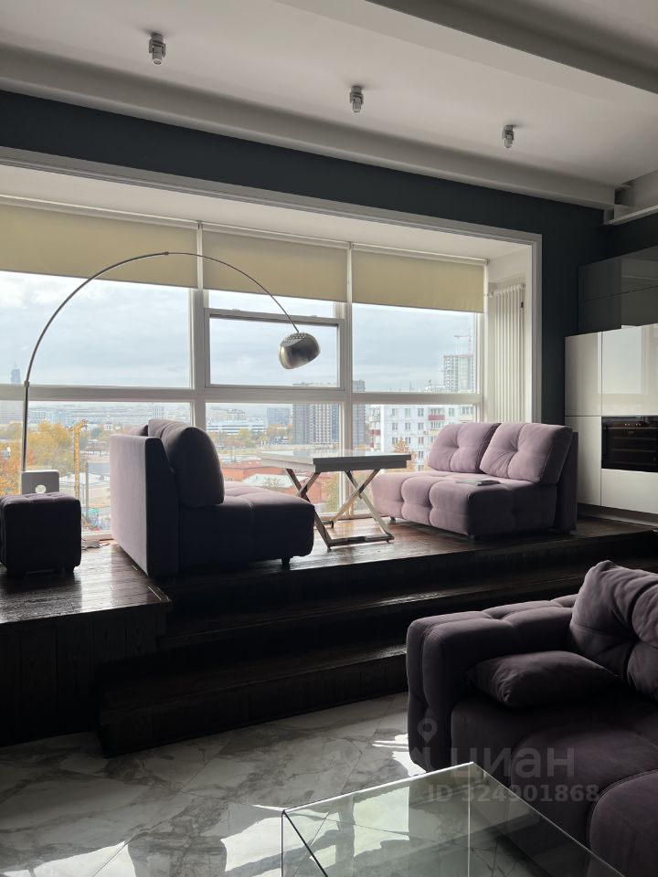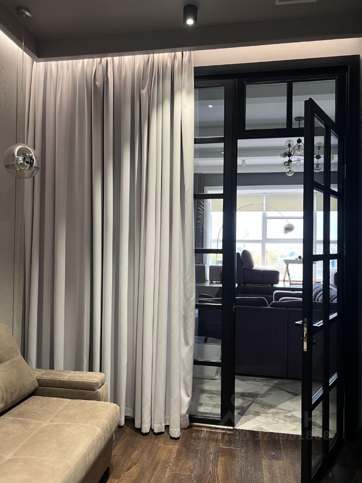 Планировка: просторная гостиная-кухня (высокие потолки, много света), спальня, кабинет, санузел (ванна и душевая), гардеробная.