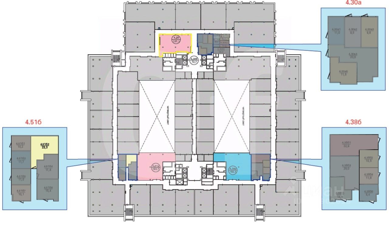 Этот лот состоит из нескольких помещений: 144 кв. м., 237 кв. м., 114 кв. м., 182 кв. м., 154 кв. м. и 268 кв.