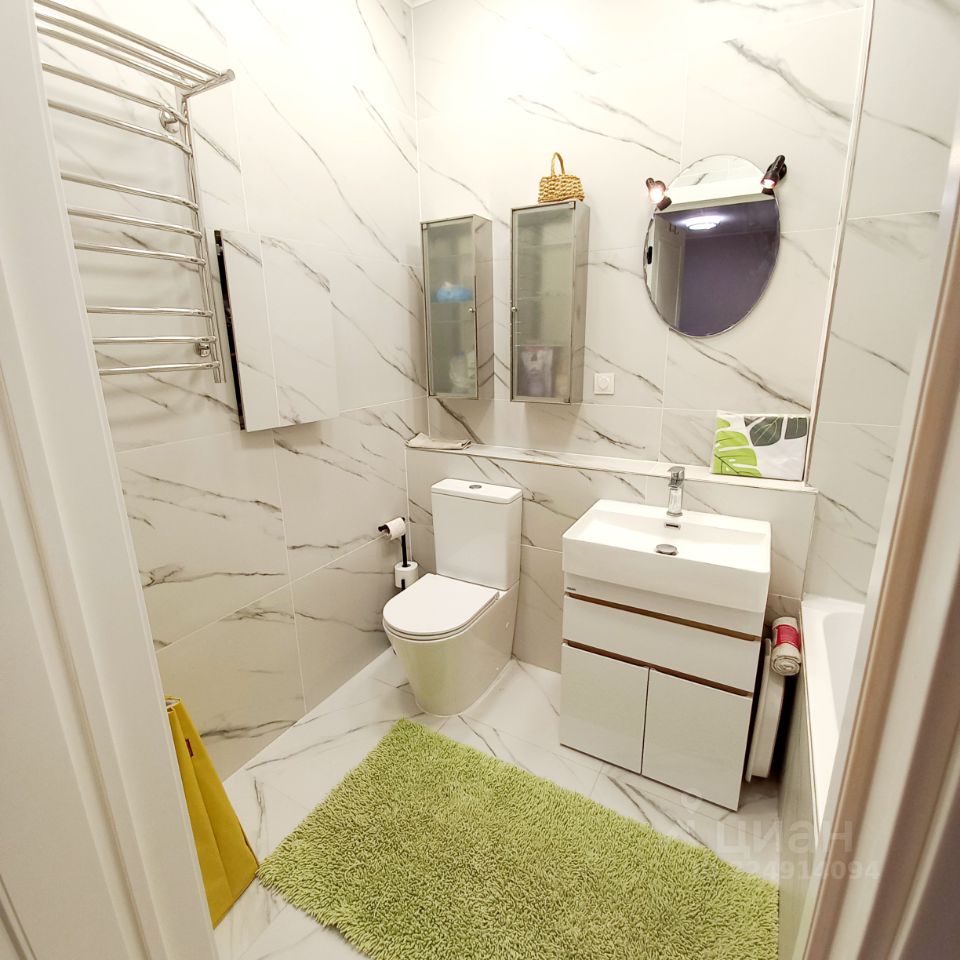 Оборудованный САНУЗЕЛ (ванна, унитаз, раковина со шкафом, зеркало с подсветкой, два навесных шкафа, полотенцесушитель).