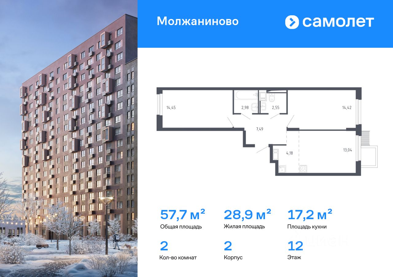 Строим кварталы для жизни с заботой о будущем. Предлагается 2-комнатная квартира комфорт-класса 57,7 кв.м в корпусе 2 на 12 этаже, в ЖК ''Молжаниново'' Квартира с чистовой отделкой. Доступность дополнительных опций уточняйте у застройщика.