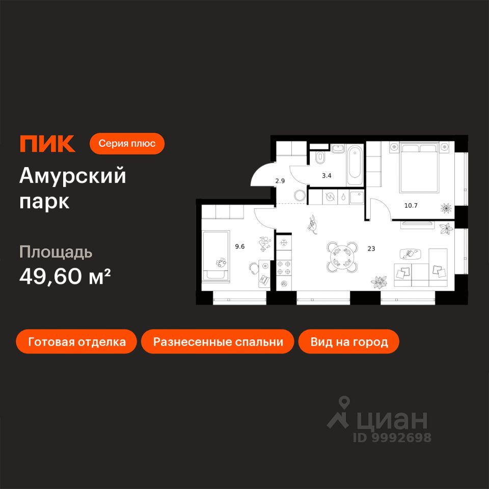 Продаётся 2-комн. квартира площадью 49,6 кв.м на 27 этаже 27 этажного дома (Корпус 4.5, Секция 6) проекта ПИК Амурский парк. Светлый просторный подъезд на уровне земли, функциональная планировка, большие окна, c отделкой.