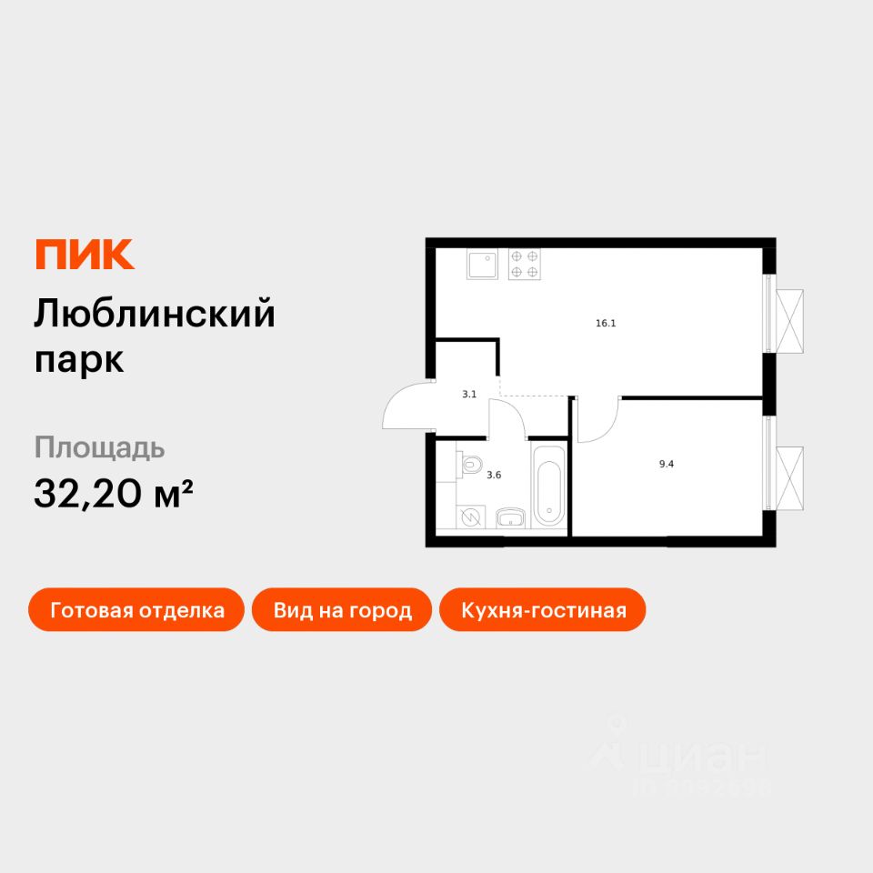 Продаётся 1-комн. квартира площадью 32,2 кв.м на 16 этаже 25 этажного дома (Корпус 12, Секция 1) проекта ПИК Люблинский парк. Светлый просторный подъезд на уровне земли, функциональная планировка, большие окна, c отделкой.