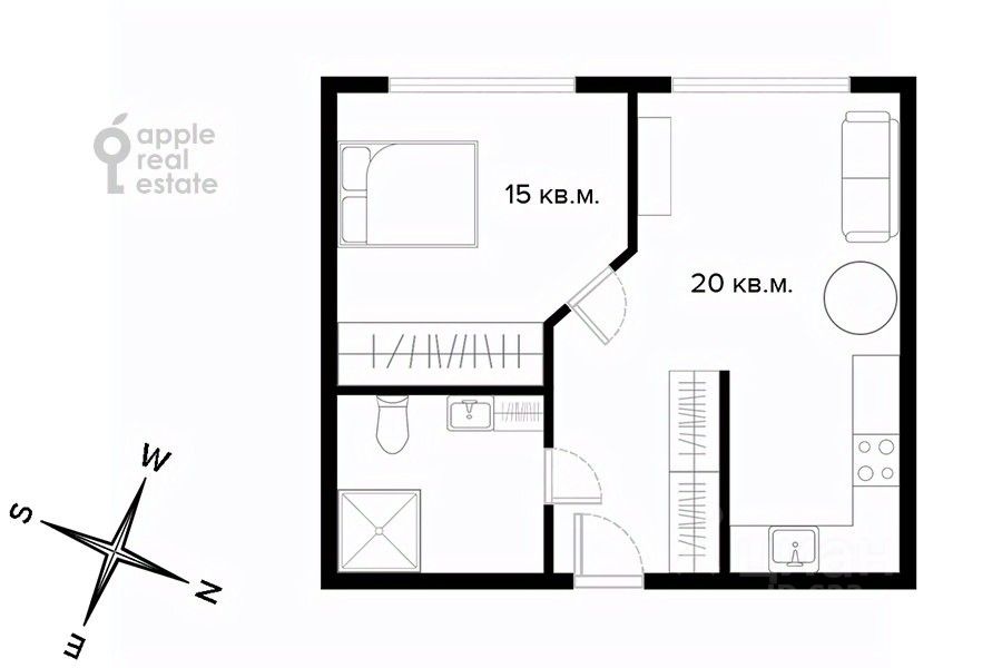 Планировка включает изолированную спальню с двуспальной кроватью (ортопедический матрас), вместительным встроенным шкафом и туалетным столиком. Объединенный санузел оснащен душевой кабиной, стиральной машиной и системами хранения. Кухня-гостиная оборудована раскладным диваном, обеденной группой, полноценной кухонной зоной с плитой, духовым шкафом и посудомоечной машиной.