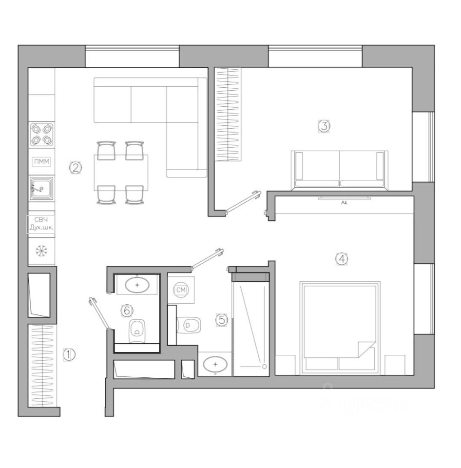 Кухня-гостиная, ДВЕ изолированные спальни, 2 с/у. Большие встроенные шкафы.