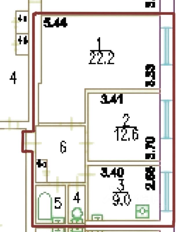 Площадь комнат: 22,2 кв.м. и 12,6 кв.м.