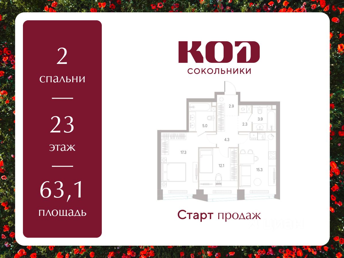 В семейном жилом квартале, расположенном в окружении более 500 га леса и объектов исторического наследия, продается 2-комнатная квартира площадью 63.1 кв. м без отделки. Квартира расположена на 23 этаже 39-этажного корпуса 2.2 жилого квартала бизнес-класса КОД Сокольники от девелопера Новая Эра.