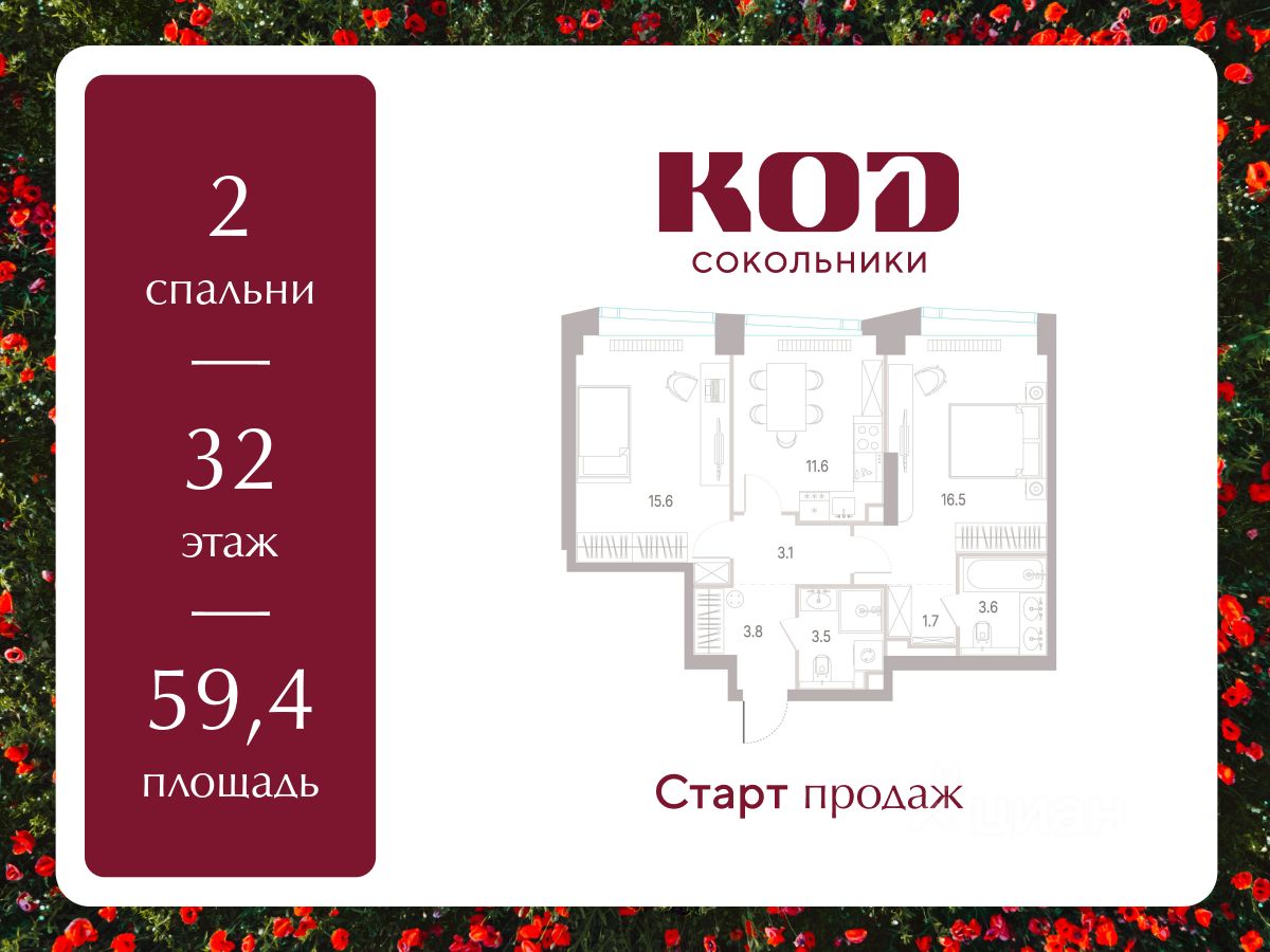 В семейном жилом квартале, расположенном в окружении более 500 га леса и объектов исторического наследия, продается 2-комнатная квартира площадью 59.4 кв. м без отделки. Квартира расположена на 32 этаже 39-этажного корпуса 2.2 жилого квартала бизнес-класса КОД Сокольники от девелопера Новая Эра.