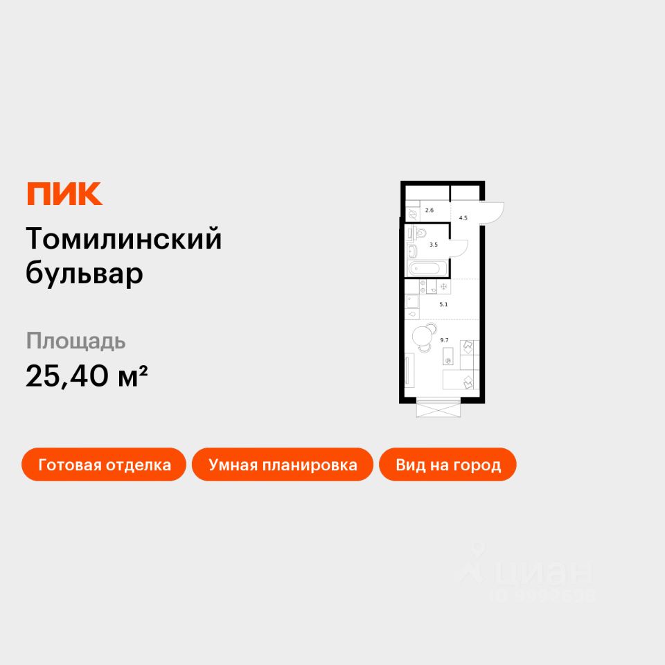 Продаётся квартира-студия площадью 25,4 кв.м на 16 этаже 25 этажного дома (Корпус 5-8, Секция 1) проекта ПИК Томилинский бульвар. Светлый просторный подъезд на уровне земли, функциональная планировка, большие окна, c отделкой.