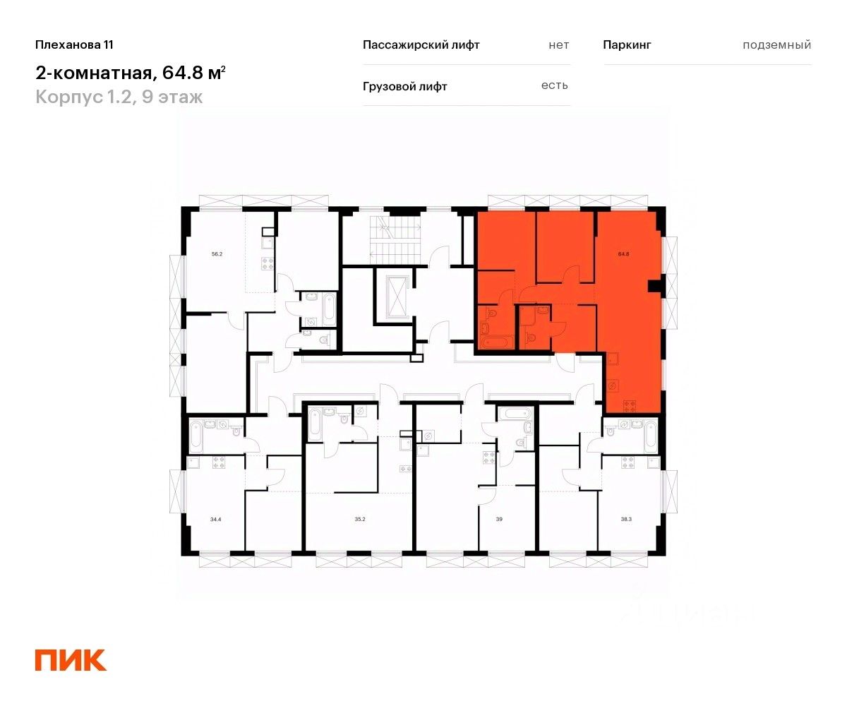 Продаётся 2-комн. квартира площадью 64,8 кв.м на 9 этаже 9 этажного дома (Корпус 1.2, Секция 2) проекта ПИК Плеханова 11. Светлый просторный подъезд на уровне земли, функциональная планировка, большие окна, c отделкой.