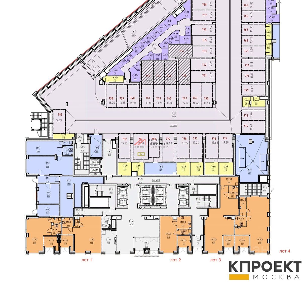 Помещение 70 м2 (лот 1), располагается на 1 этаже, открытая планировка, отдельный вход с фасада, витринные окна по фасаду. Располагается на дворовой территории жилого комплекса. Высота потолка 5,7 м.