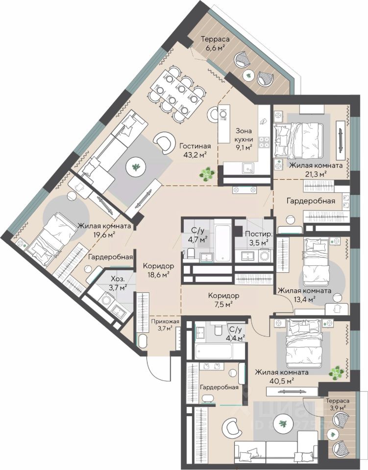 Продаётся 4-комнатная квартира в строящемся доме (Секции 2.3-2.4), срок сдачи: I-кв. 2028, общей площадью 187.2 кв.м., на 26 этаже.