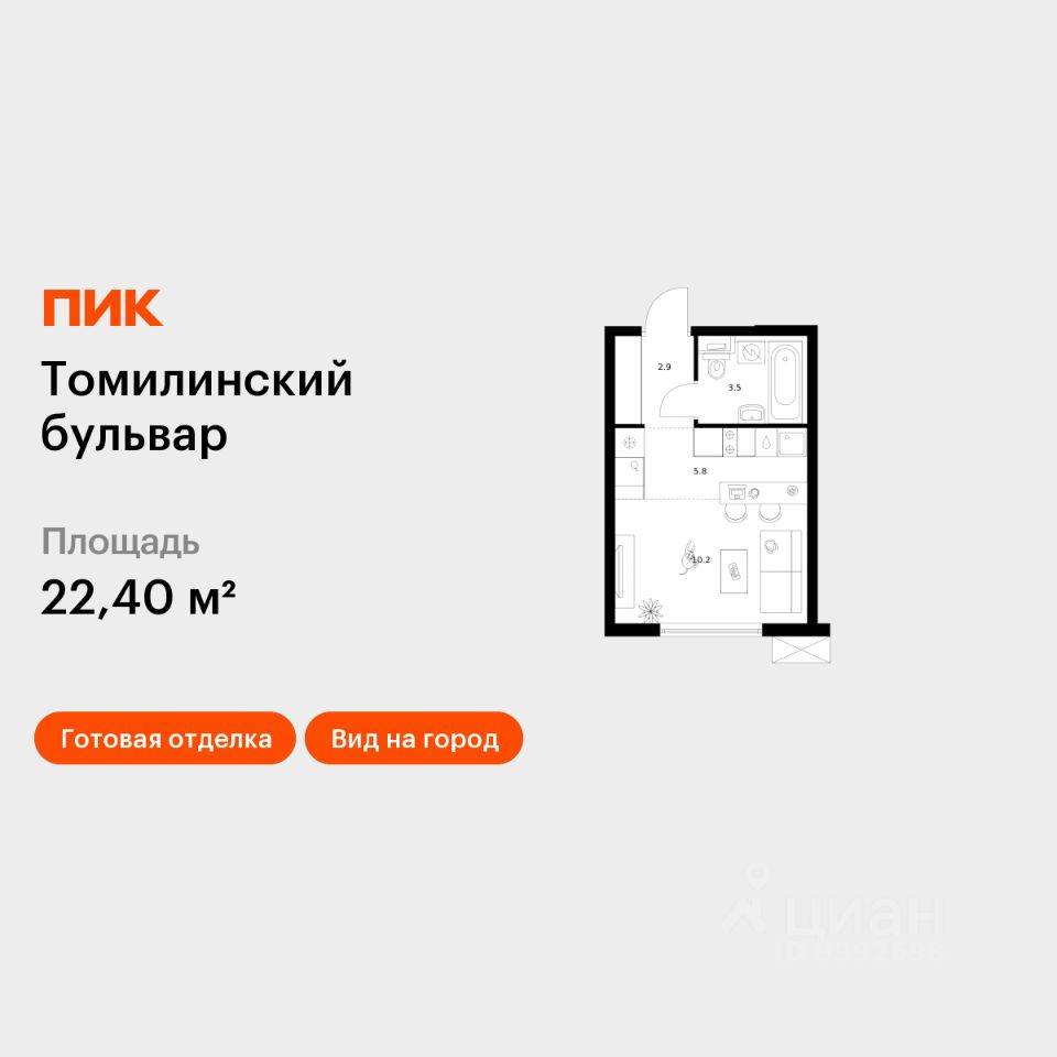 Продаётся квартира-студия площадью 22,4 кв.м на 4 этаже 25 этажного дома (Корпус 5-8, Секция 2) проекта ПИК Томилинский бульвар. Светлый просторный подъезд на уровне земли, функциональная планировка, большие окна, c отделкой.