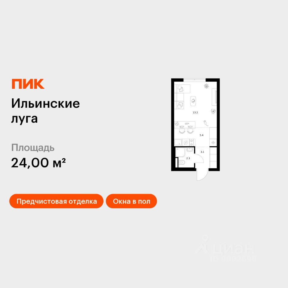 Продаётся квартира-студия площадью 24 кв.м на 9 этаже 9 этажного дома (Корпус 4.3, Секция 1) проекта ПИК Ильинские луга. Светлый просторный подъезд на уровне земли, функциональная планировка, большие окна, предчистовая отделка.