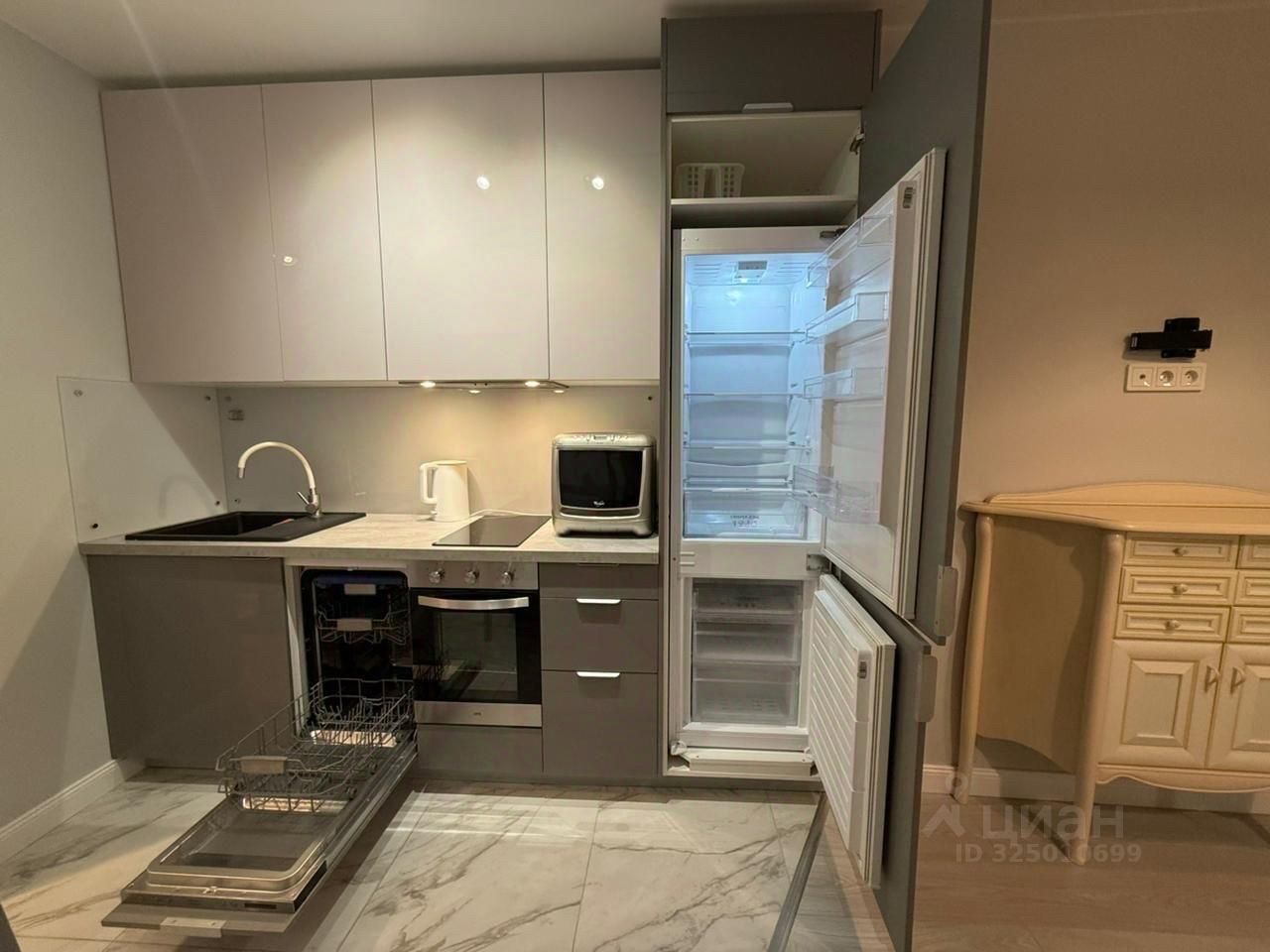 Квартира с дизайнерским ремонтом, полностью меблирована и оснащена современной техникой. В просторной комнате и на кухне есть всё необходимое для комфортного проживания: кондиционер, холодильник, посудомоечная и стиральная машины. Ванная комната оборудована ванной и совмещённым санузлом. Также имеется лоджия, где можно наслаждаться свежим воздухом.