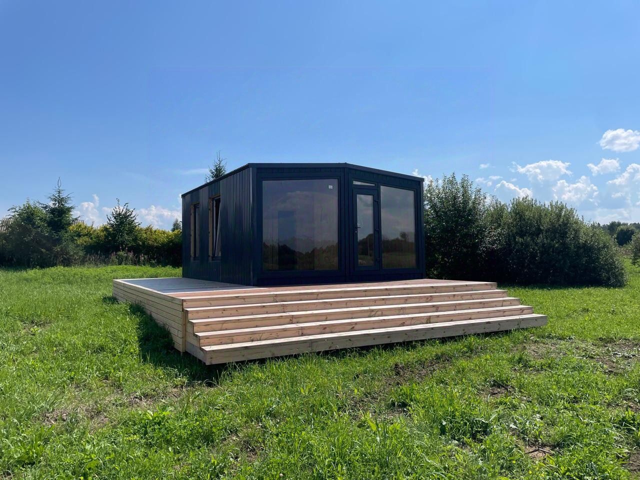 •Силовой каркас из сухой доски камерной сушки, обработанной огнебиозащитой. •Внешняя отделка: комбинированная вертикальная имитация бруса (сорт АВ, ширина 140 мм, толщина 20 мм) и профлист (RAL 7024). •Остекление: ПВХ профиль 70 мм с тройным остеклением и двухкамерным стеклопакетом. •Утепление: минеральная вата (150 мм). Пароизоляционные и защитные материалы. •Внутренняя отделка: стены вертикальная имитация бруса (сорт АВ), полы OSB 20мм с ламинатом 33 класса, потолок имитация бруса (сорт АВ). •Электропроводка скрытая, с применением кабеля ВВГнг ГОСТ в защитной гофре. Интерьерные светильники и розетки.