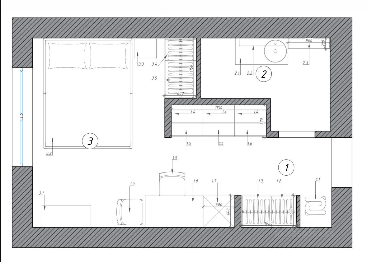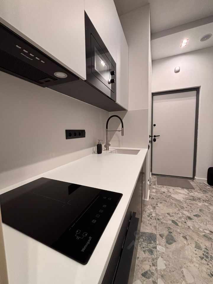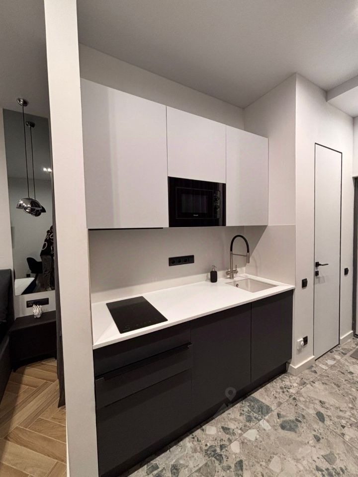 Планировка-трансформер: Кухонная зона отделена от спальни. Это редкость для студий. Здесь нет чувства, что спишь на кухне. А еще — две полноразмерные встроенные гардеробные ниши. Все вещи убираются, пространство дышит.