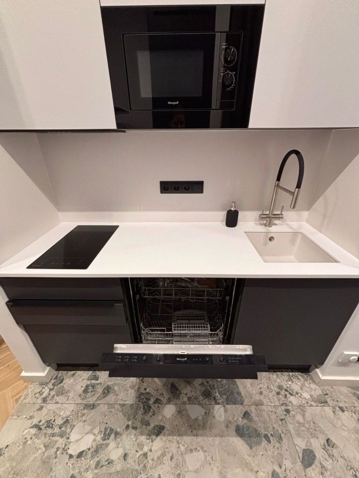 Кухня: встроенная, с тонкой современной столешницей из искусственного камня, мойкой подстольного монтажа и встроенным полноразмерным холодильником. Посудомойка. Индукционная варочная панель, фильтр питьевой воды.