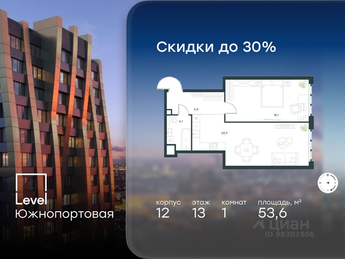 В северной части района Печатники продается 1-комнатная квартира площадью 53.60 кв.м без отделки. Квартира расположена на 13 этаже 20-этажного корпуса 12 в жилом комплексе комфорт-класса Level Южнопортовая (компания Level Group/Левел групп).