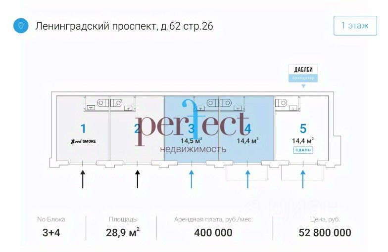 - Меньше 1 минуты до станции метро Аэропорт. - 1-я линия домов, сверхинтенсивный пешеходный и автомобильный трафик, отличная визуализация, высокий рекламный потенциал и возможность размещения вывески на фасаде.