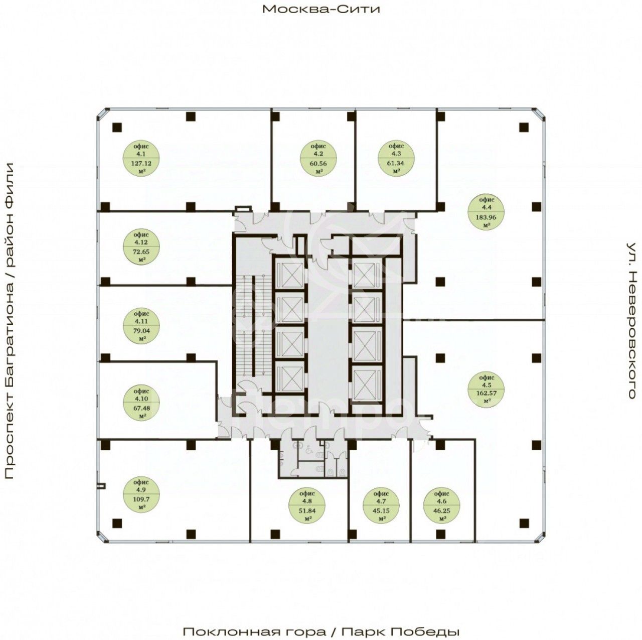 Архитектура и дизайн: Панорамное остекление в каждом офисном блоке, лаконичность и строгость форм. Этаж разделен на 12 офисных блоков площадью от 64,5 до 270 кв.м. Внутренние пространства сочетают в себе комфорт, камерность и технологии: просторные офисы с высотой потолков 3,7 м, приватные офисов с террасами, highspace-офисы с высотой потолков 7,5м, зоны отдыха, двухсветное лобби с потолками 11,5 метров и площадью 250 кв.метров с приватной зоной для отдыха и встреч.