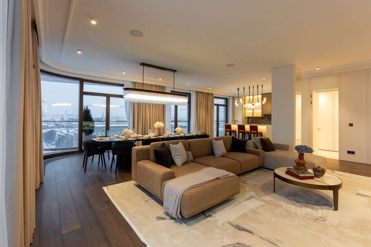 Просторная светлая квартира площадью 327.2 кв. м. В кухне-гостиной (79.3 кв. м) они выходят в живописный внутренний двор, где протекает ручей, а панорамное остекление и моллированные окна улучшают видовые характеристики квартиры. Продуманная планировка позволяет разместить шесть приватных спальных комнат с отдельными гардеробными и санузлами.