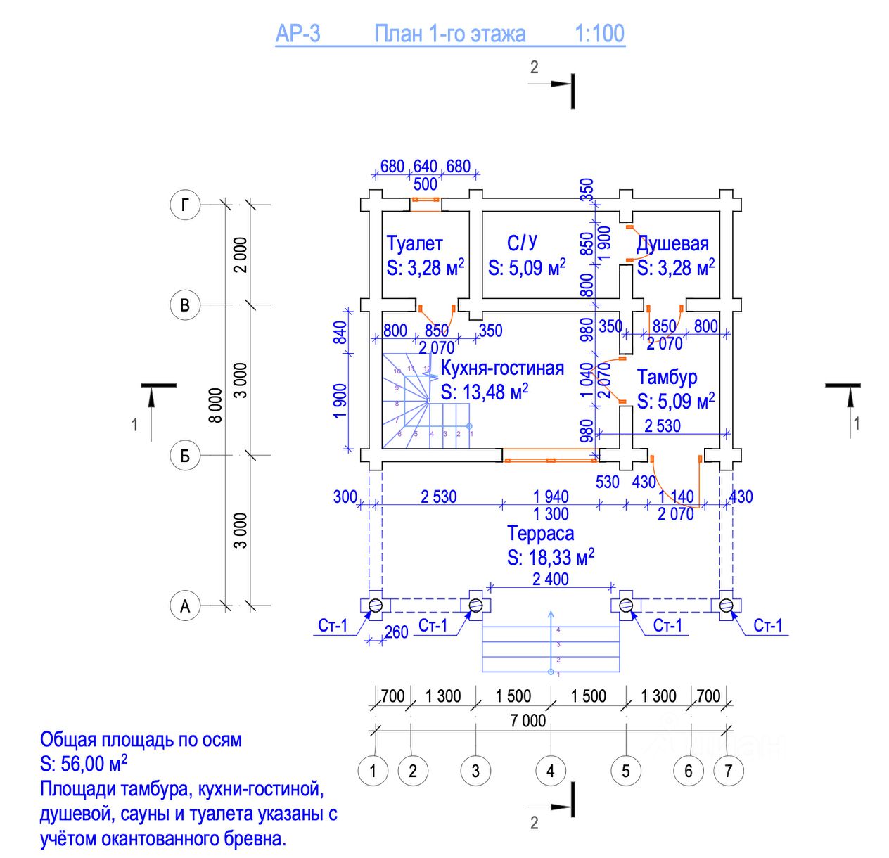 Планировка 1 этаж: прихожая, санузел, котельная, кухня, гостиная, терраса. 2 этаж: просторная комната 28 м² с выходом на балкон (можно разделить на 2 спальни).