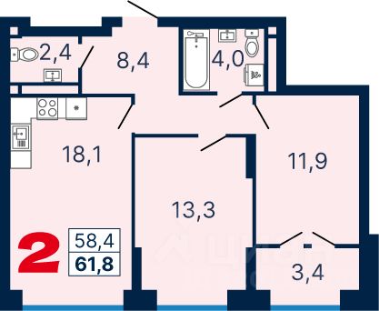 Продаётся квартира в ЖК ''Тёплые кварталы''. 2-комнатная квартира, 61,87 м², 219, Очередь 3, дом 2. Стоимость указана с учетом чистовой отделки.