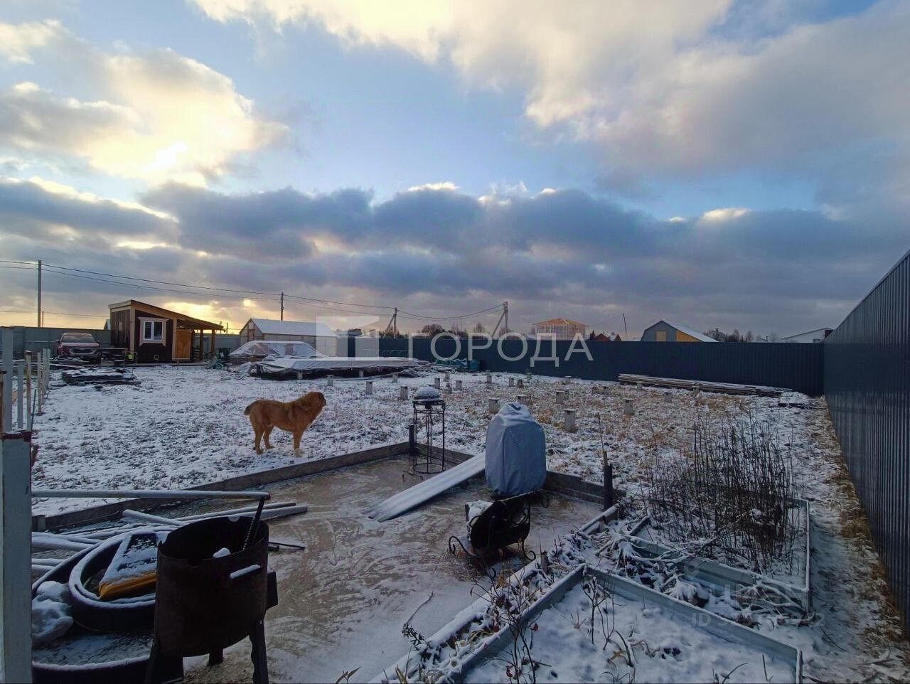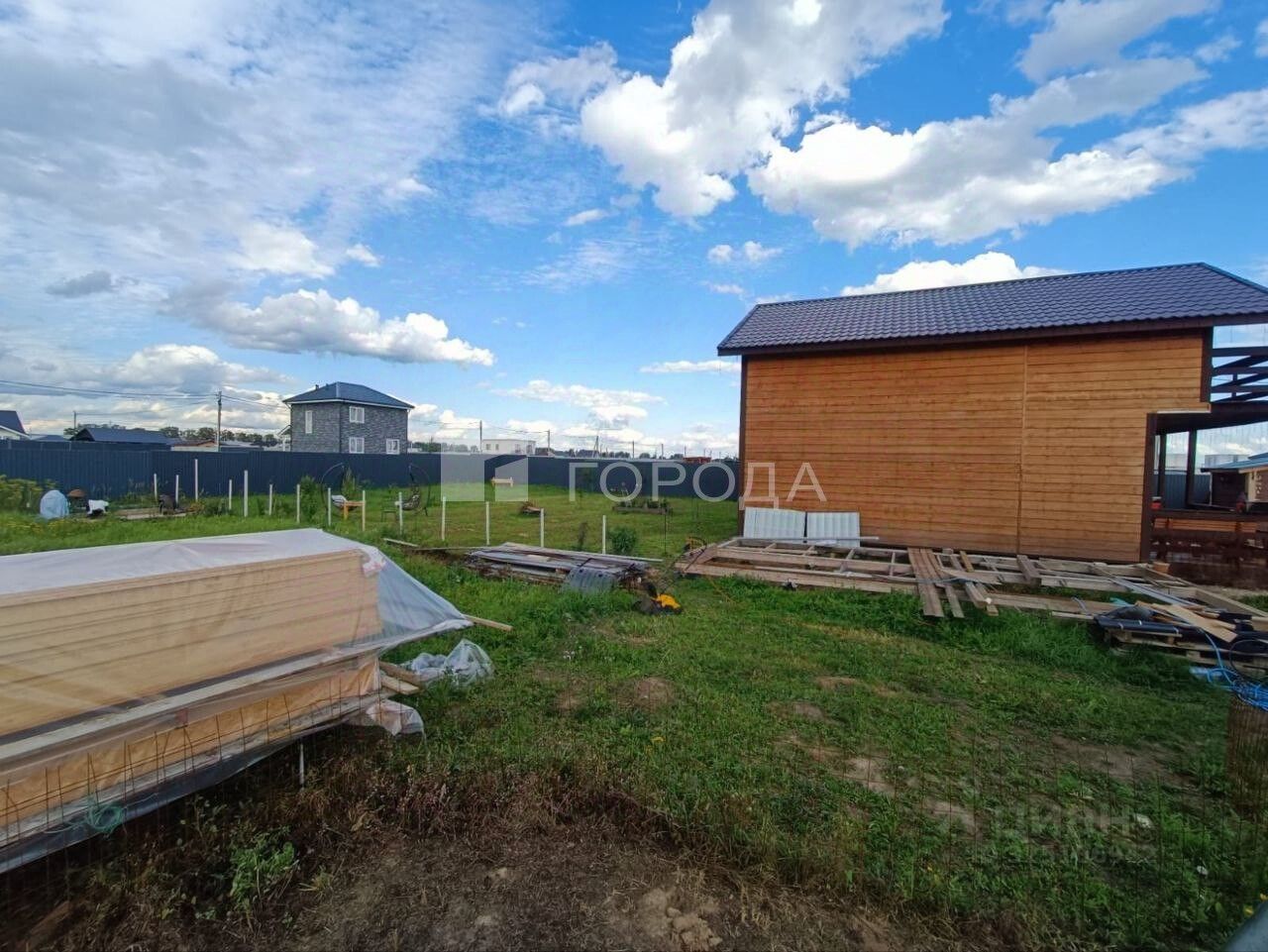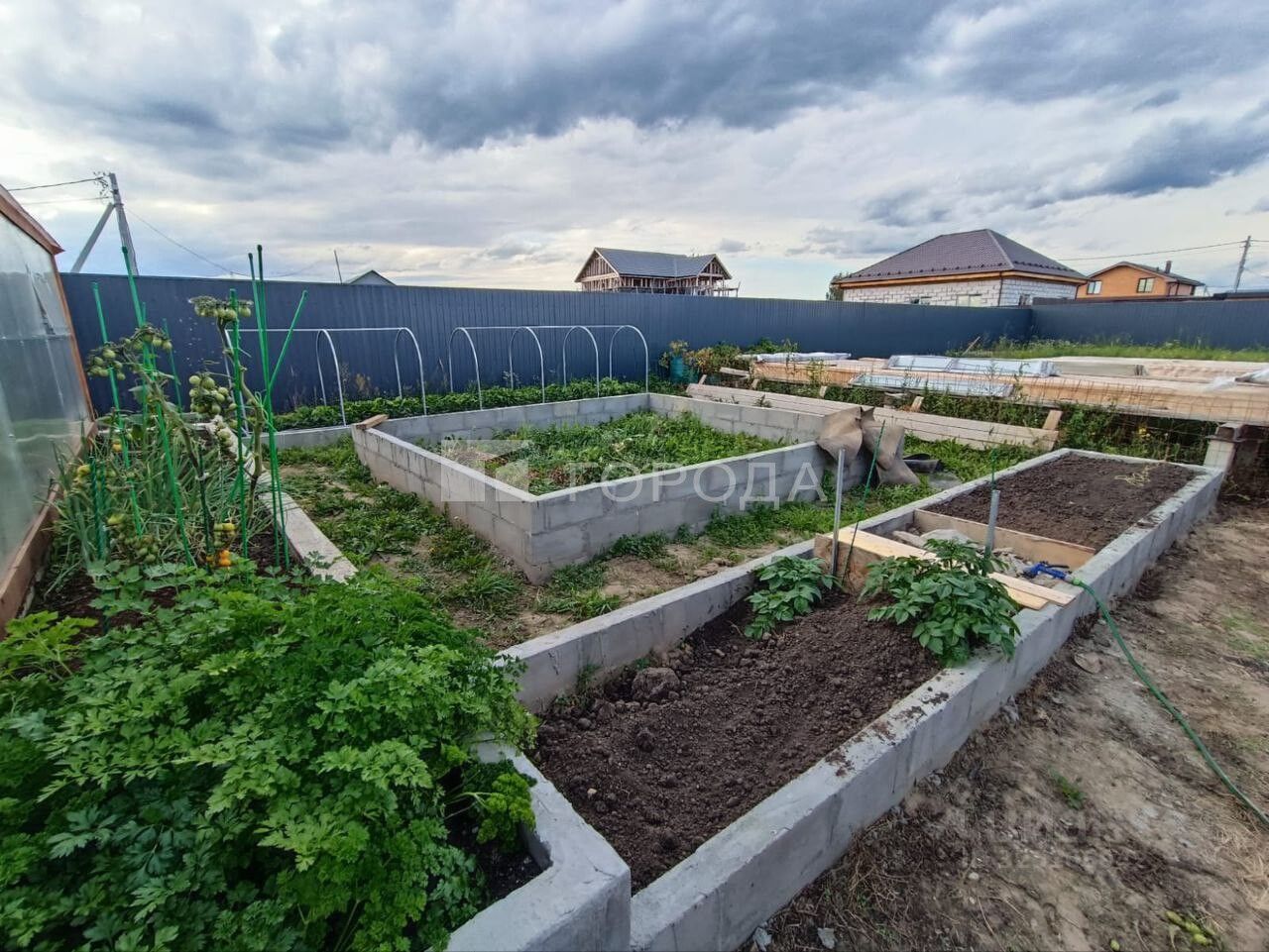 Участок 14,4 сотки (состоит из двух) выровнен и ухожен, обнесен забором. Разбиты грядки, установлена теплица на заливном фундаменте, вольер для собаки, бытовка с поленницей.