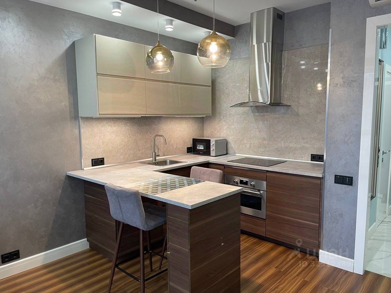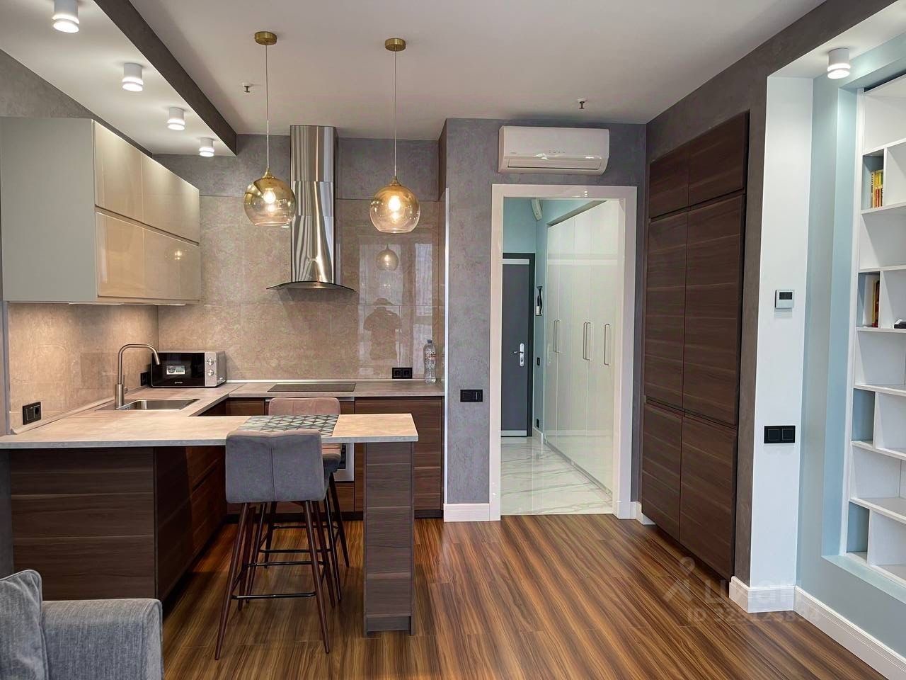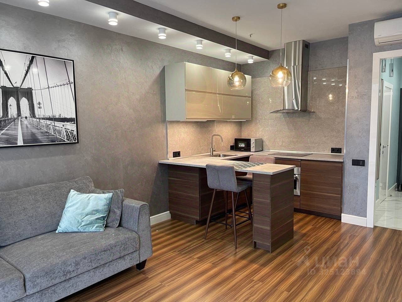 В апартаментах выполнен дизайнерский ремонт, который подчеркивает уникальность и современность пространства. Уютная кухня площадью 7 кв. м оборудована всем необходимым для комфортного проживания. Совмещенный санузел оформлен в современном стиле и оснащен качественной сантехникой. Все детали интерьера тщательно продуманы для удобства и функциональности.