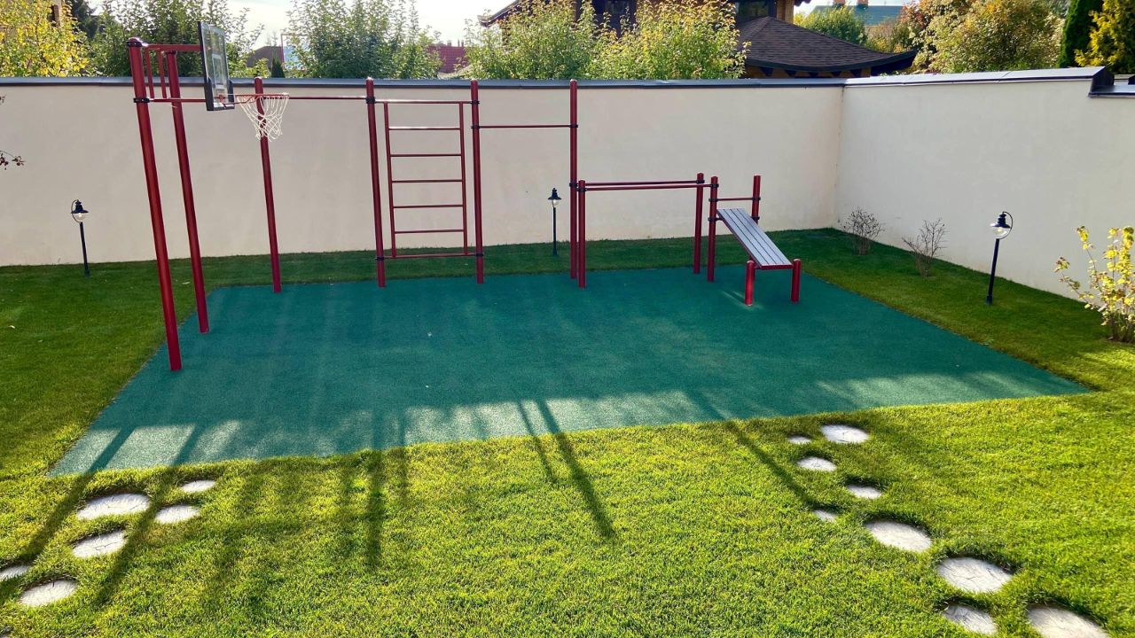 Участок: •зона барбекю / мангал, •спортивная площадка, •беседка с колодцем, •плодовые деревья и рябины.