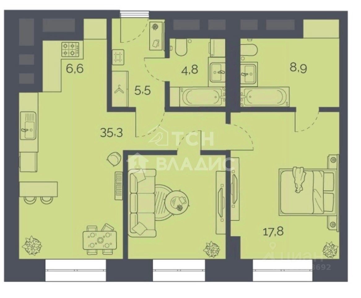 В квартире площадью 79 метров, из которых 35 кухня-гостиная и две спальни 17 и 18 метров, выполнен качественный дизайнерский ремонт и установлена абсолютно новая мебель, со всей необходимой встроенной техникой. Два санузла. Так же, имеется гардеробная комната и кладовка. Все предметы интерьера входят в стоимость. Высокие потолки - 3.0 метра. Окна квартиры выходят на улицу. Дом оборудован двумя пассажирскими и одним грузовым лифтами. При входе в подъезд расположено комфортное лобби, а так же находится круглосуточный охранник. В доме имеется подземный 3-уровневый паркинг. Инфраструктура дома соответствует современным стандартам качества и безопасности.