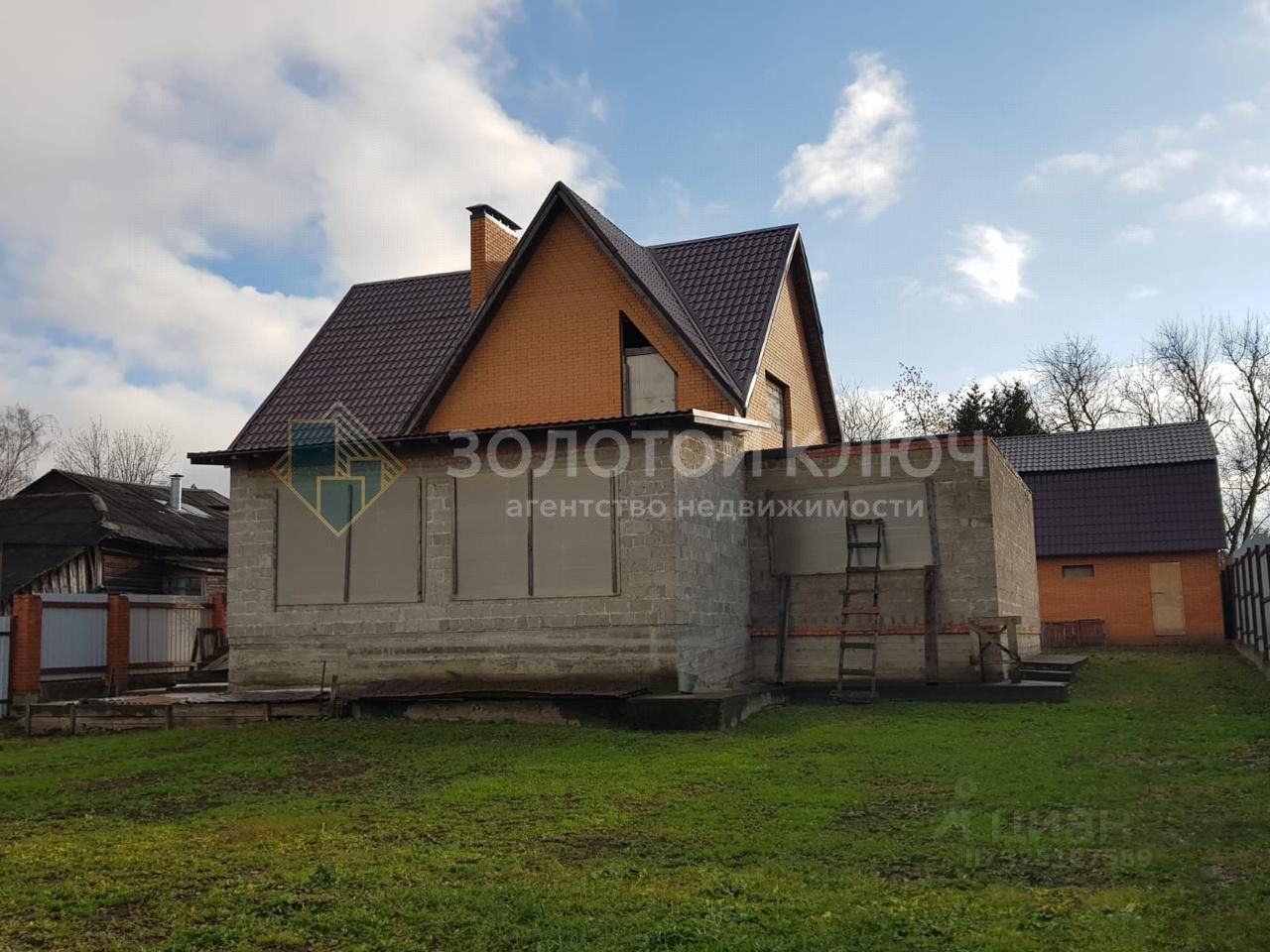 Фундамент ленточный. Дом построен из блоков и облицован кирпичём.