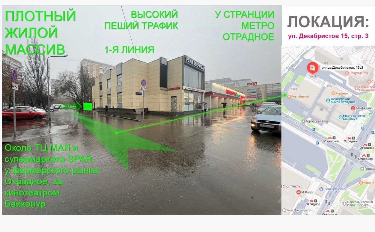 Прямая продажа от собственника! Стритритейл! Стоимость до 31 декабря! Отдельно стоящее здание, первая линия, первый этаж, площадь 153,7 кв.м., ПЯТЬ отдельных входов, окна смотрят во двор Находится здание около ТЦ МАЛ и супермаркета SPAR-СПАР, рядом фермерский рынок Отрадное и кинотеатр Байконур Мощность 15 кВт, мокрой точки нет, но подали заявку, земля пока городская До метро Отрадное 300 м, плотный жилой массив, высокий пеший трафик Согласно планировке 4 помещения внутри с окнами ИФНС 15, УСН (в НГ +5%) Хорошая инфраструктура: бары, кафе, магазины, торговля. Транспортная доступность: удобный заезд с Северного б-ра. Другие станции метро: Бибирево, Владыкино.