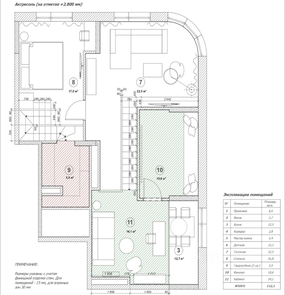В отдельный блок выделена мастер-спальня с ванной комнатой и гардеробной на 2-м уровне.