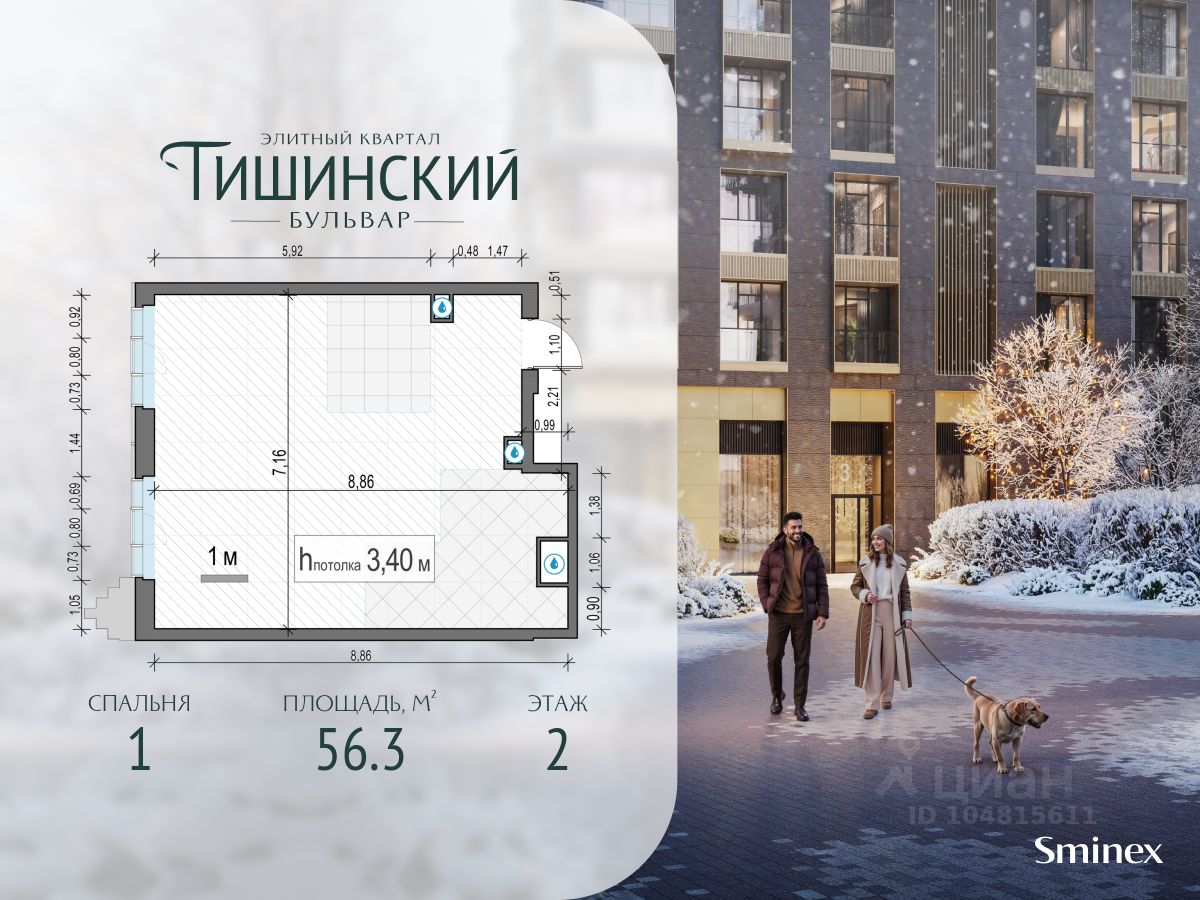 В продаже 1-комнатная квартира квартира в элитном квартале ''Тишинский бульвар''. Общая площадь квартиры - 56.30 кв.м. Этаж 2 из 14. Корпус К3.