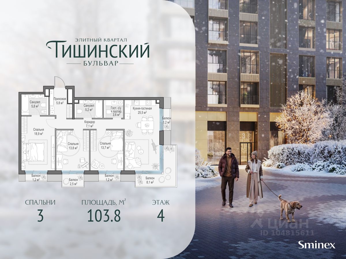 В продаже 3-комнатная квартира квартира в элитном квартале ''Тишинский бульвар''. Общая площадь квартиры - 103.80 кв.м. Этаж 4 из 9. Корпус 8С2.