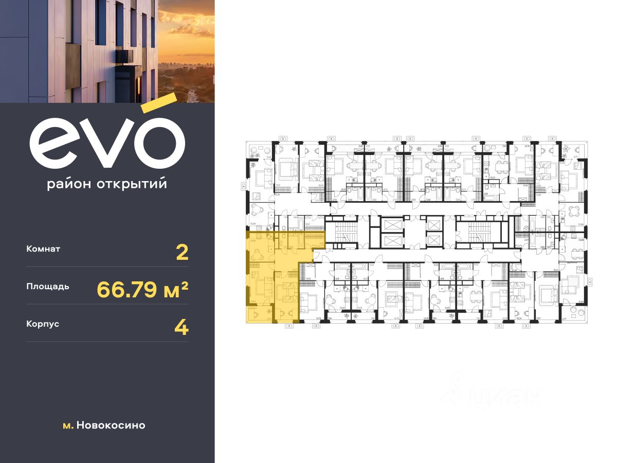 Продается двухкомнатная квартира 66.79 кв.м. в жилом комплексе EVO на 23 этаже по адресу: Московская область, г. Реутов, ул. Комсомольская. Скидка 15% на выделенный пул трёхкомнатных квартир с готовностью в 2026 году!* EVO - проект комфорт-класса от девелопера Dogma. Каждый житель сможет открыть для себя максимум возможностей. Совершенствоваться во всех направлениях: физическом, эмоциональном и материальном. В EVO можно открыть для себя новые виды спорта, найти единомышленников по хобби, партнеров по бизнесу, развивать в детях новые грани, наслаждаться природой и лаконичной архитектурой.