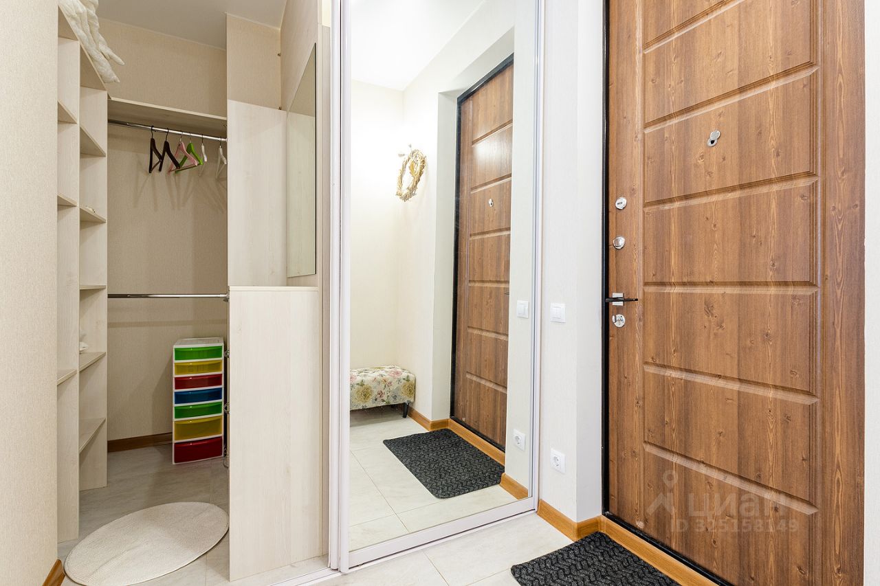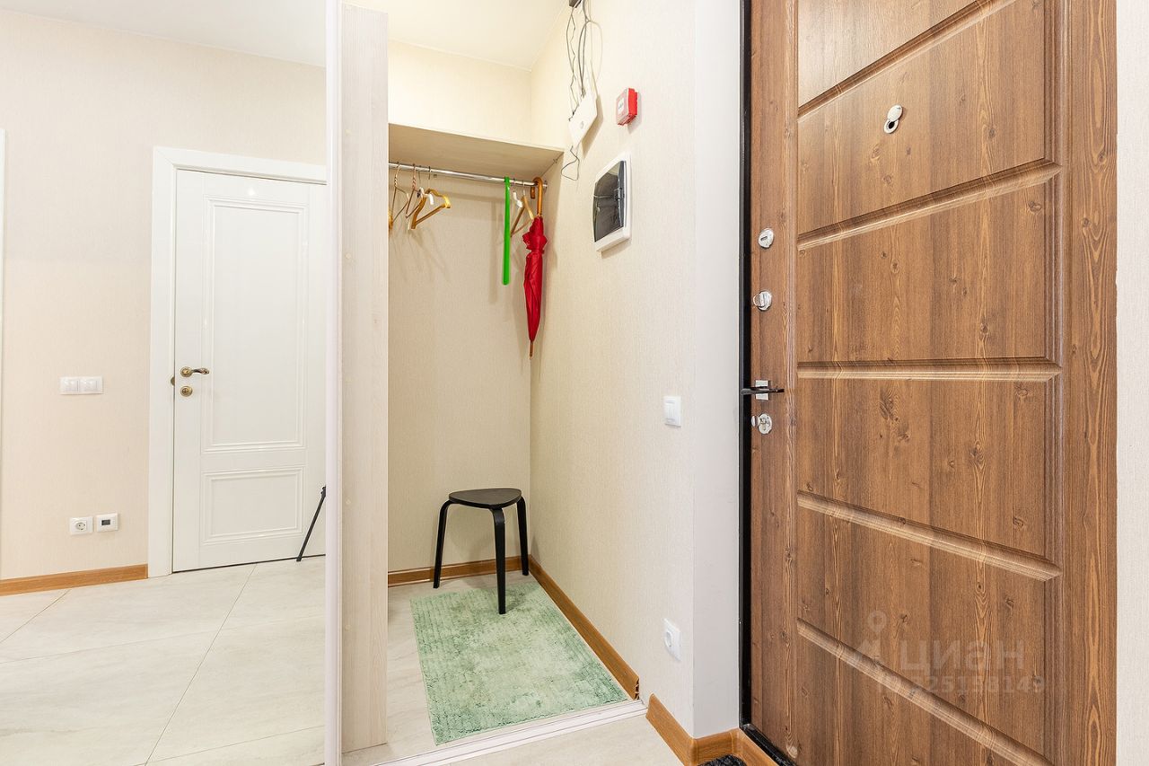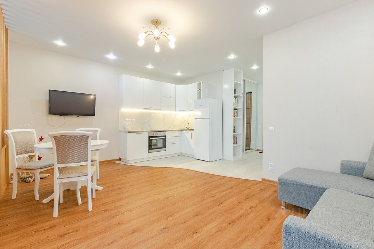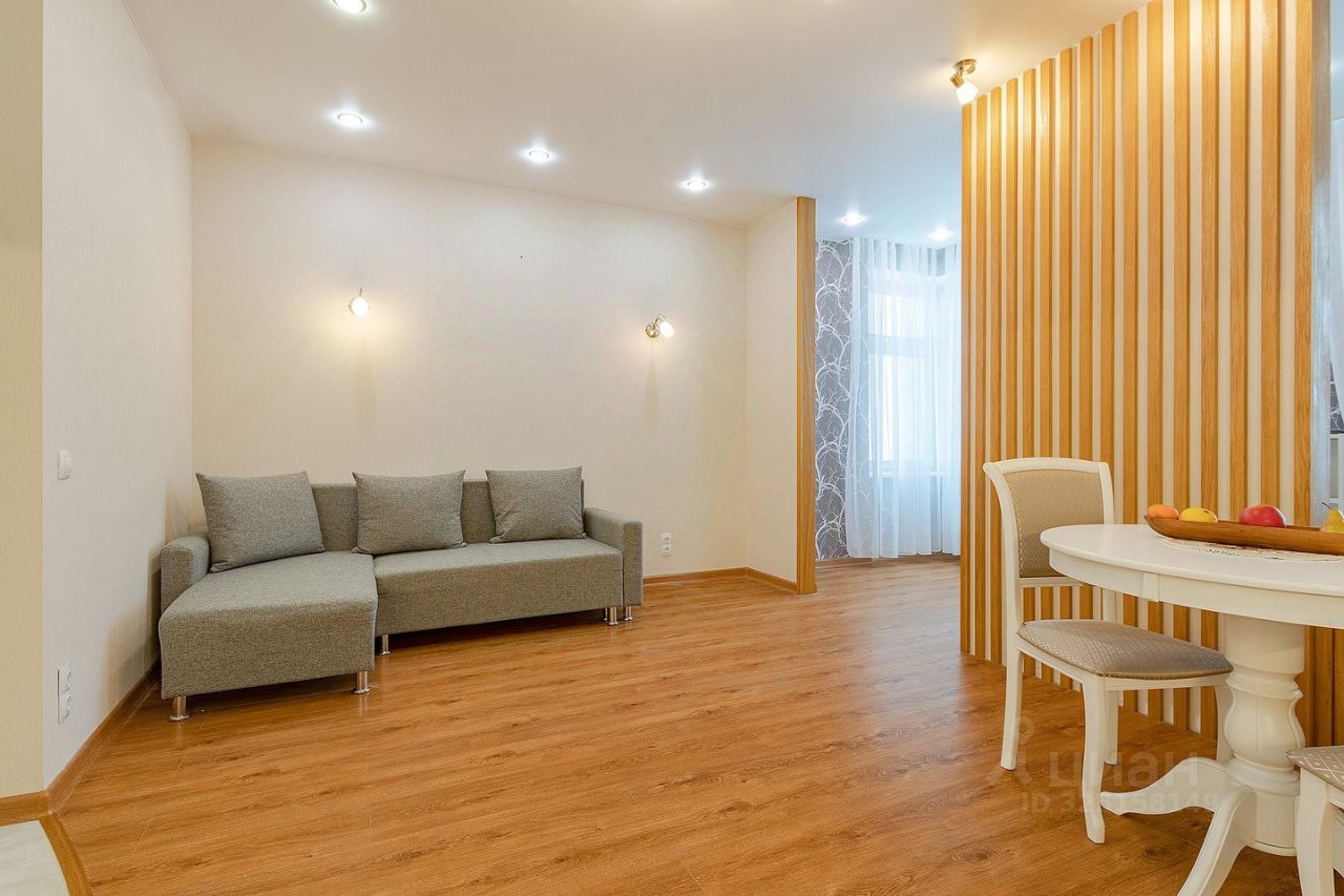 Сдается квартира площадью 46 кв.м. на 12-м этаже 46-ти этажного дома. Квартира имеет студийную планировку с зонированным пространством: кухня, гостиная, спальня и место для рабочего кабинета. В квартире есть гардеробная комната, совмещенный санузел с душем, постирочная.