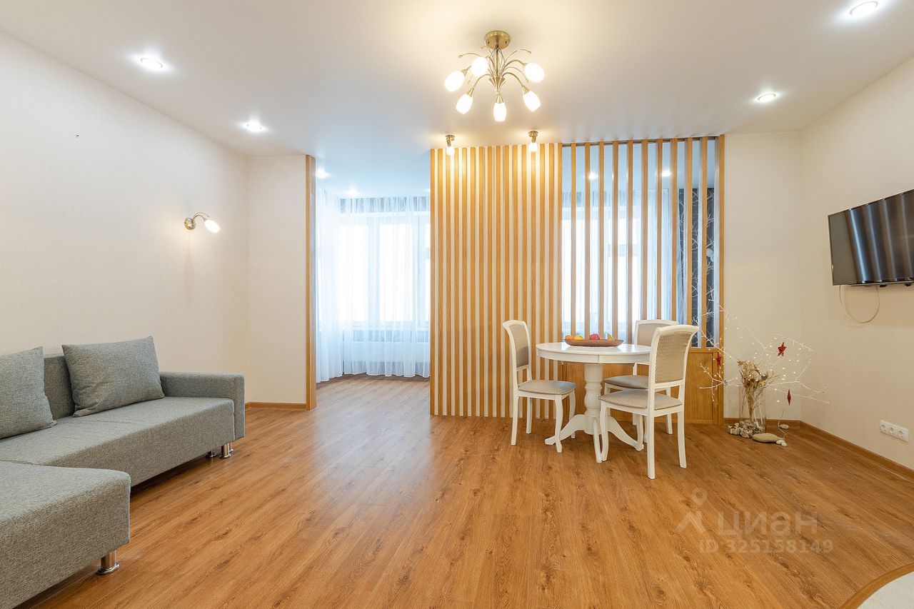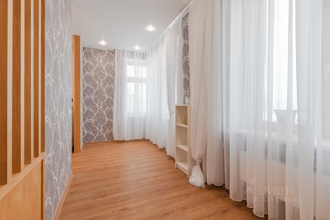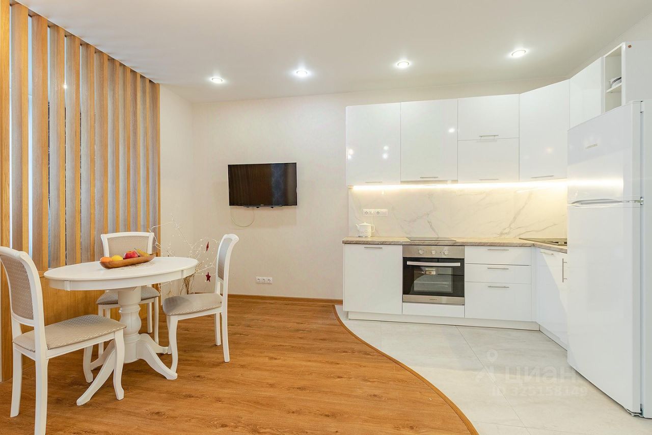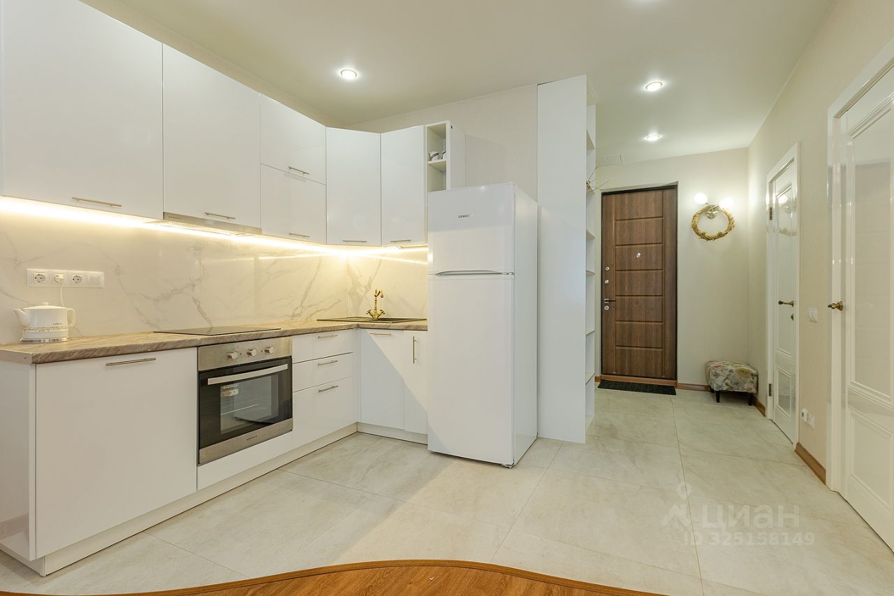 Сдается квартира площадью 46 кв.м. на 12-м этаже 46-ти этажного дома. Квартира имеет студийную планировку с зонированным пространством: кухня, гостиная, спальня и место для рабочего кабинета. В квартире есть гардеробная комната, совмещенный санузел с душем, постирочная.