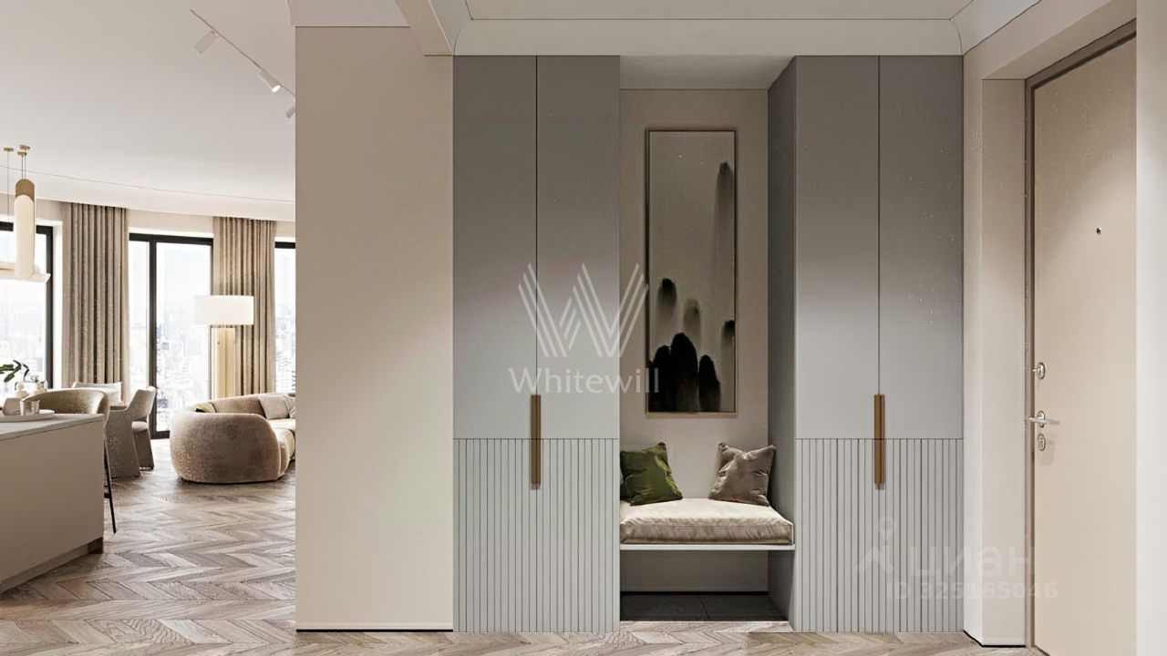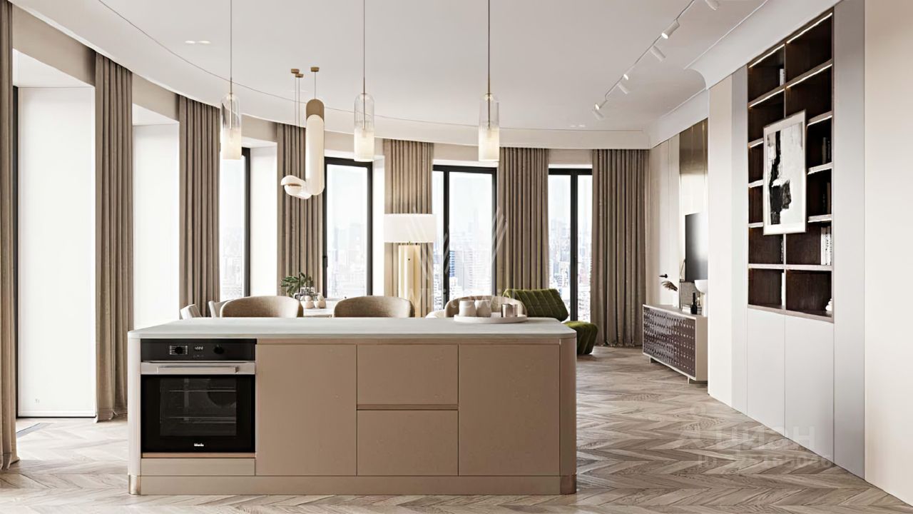Внутри — тишина, свет и правильный объём: в квартире 172 м², где пространство не давит, а освобождает. Главная сцена — кухнягостиная 51 м²: здесь легко проводить длинные семейные вечера и так же легко оставаться наедине, когда город остаётся за стеклом.
