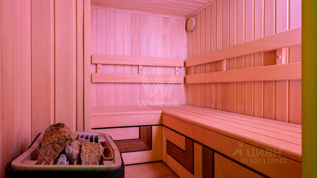 На 1-м этаже спланирована просторная гостиная-столовая с действующим дровяным камином, кухня с обеденной зоной, гардеробная в прихожей и гостевой санузел, На 2-м этаже: 2 спальни со полноценными санузлами и местами для хранения вещей. Цокольный этаж: кладовое помещение, постирочная комната с местами хранения, гардеробная, санузел с душевой и сауна.