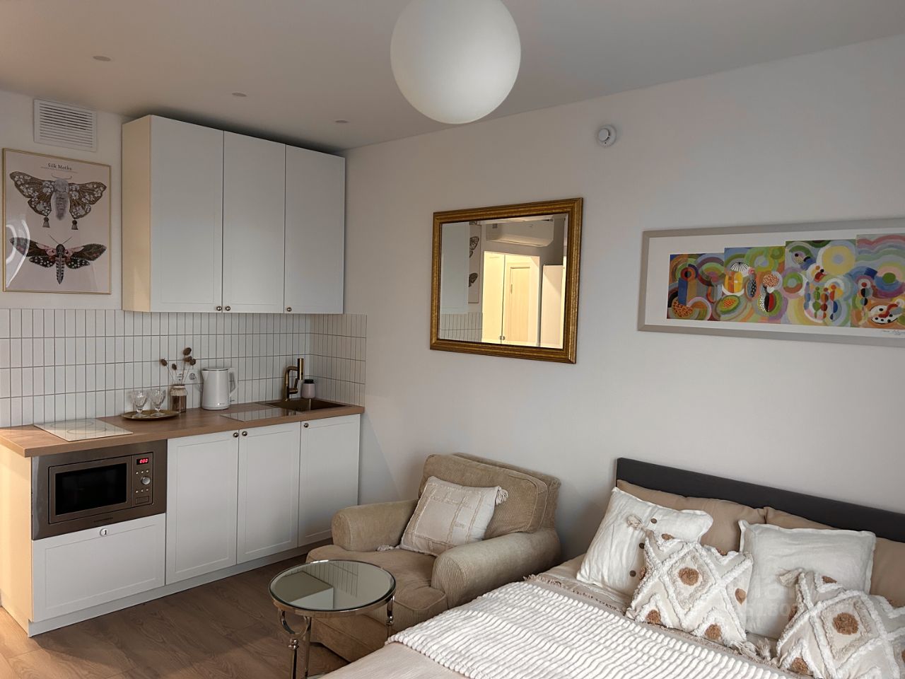 Квартира полностью меблированная - новая кровать с ортопедическим матрасом Икеа, кресло, большой холодильник Gorenje, варочная панель, СВЧ, стиральная машина Haier, установлен кондиционер и много места для хранения вещей.