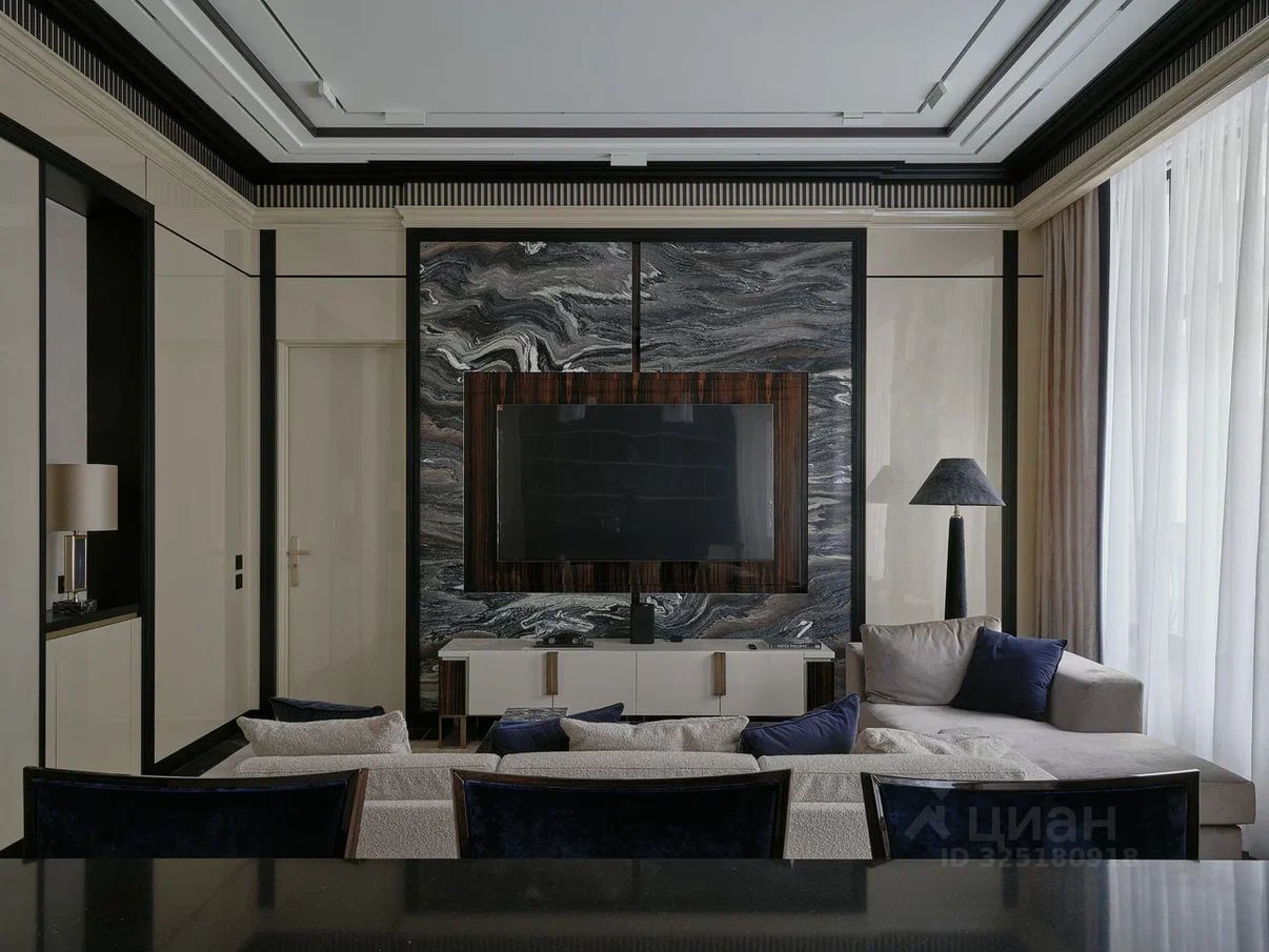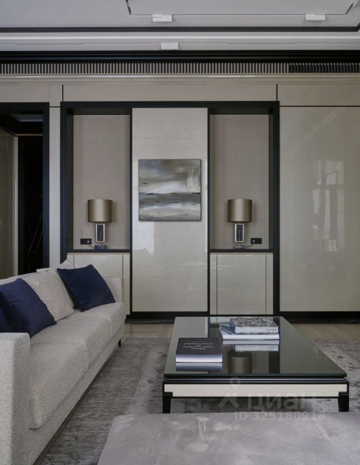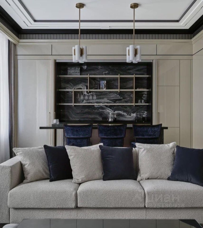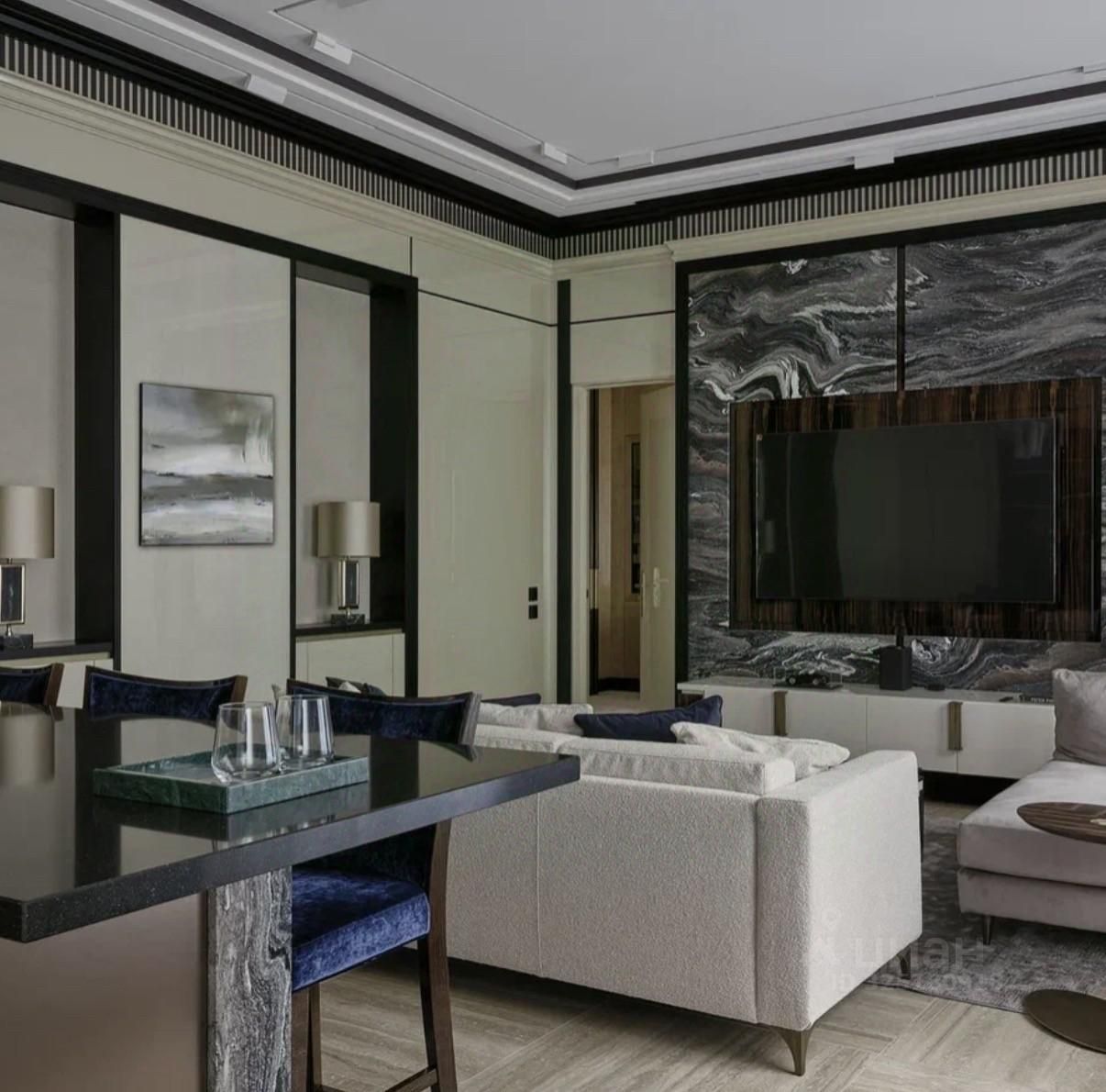 Апартаменты меблированы и декорированы в премиальном современном стиле с элементами неоклассики. В отделке использованы натуральные материалы: камень с выразительной текстурой, шпон ценных пород дерева, латунные и графитовые акценты. Интерьер выполнен в спокойной, благородной палитре — актуален вне времени.