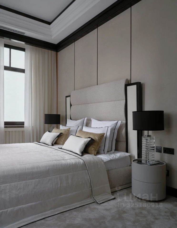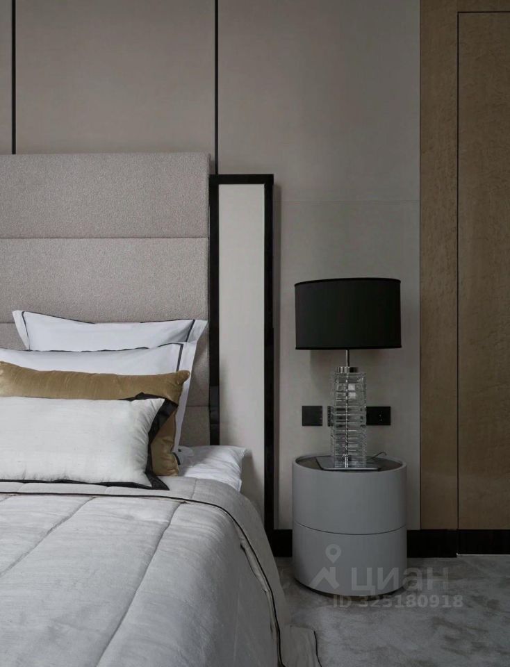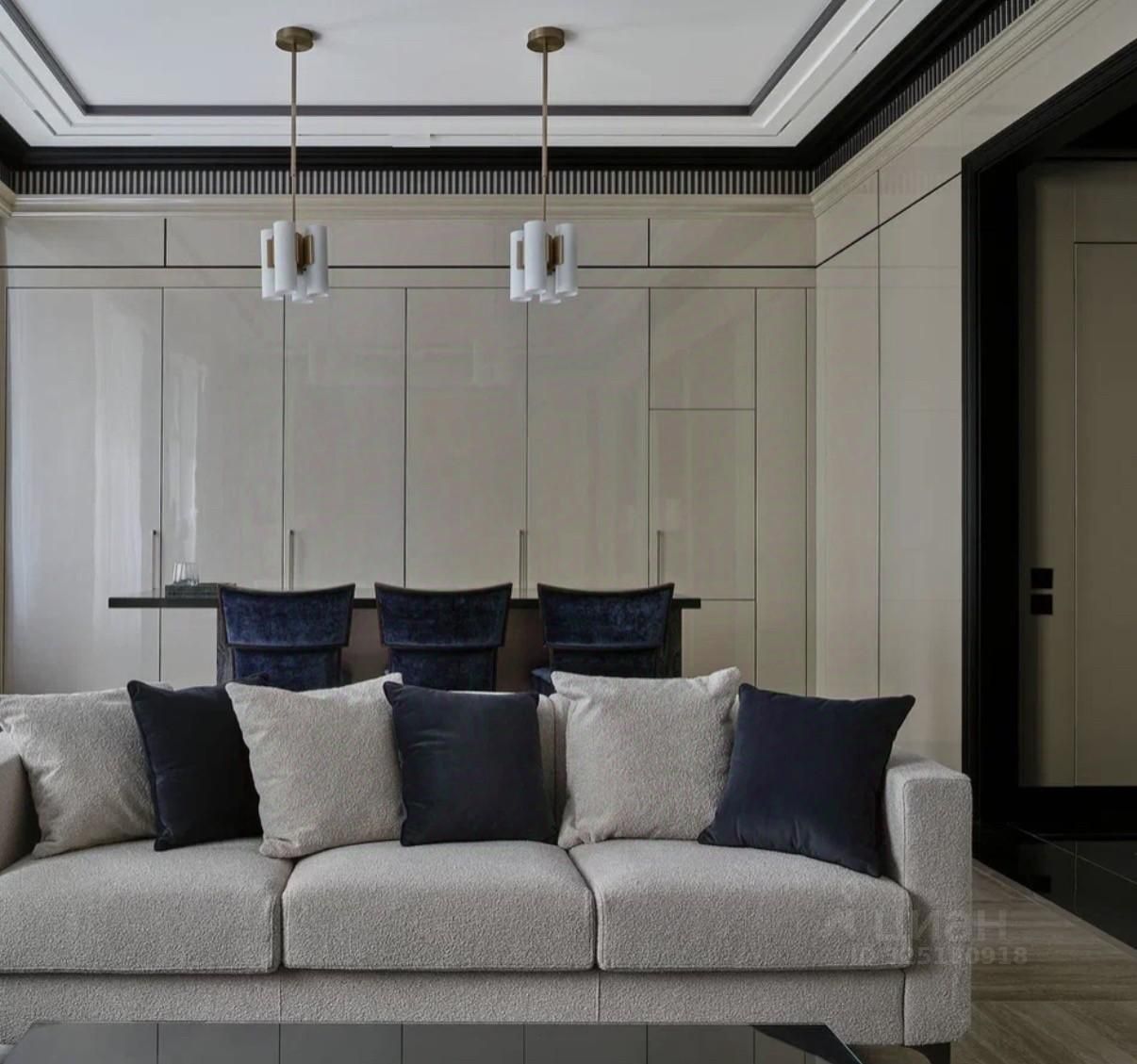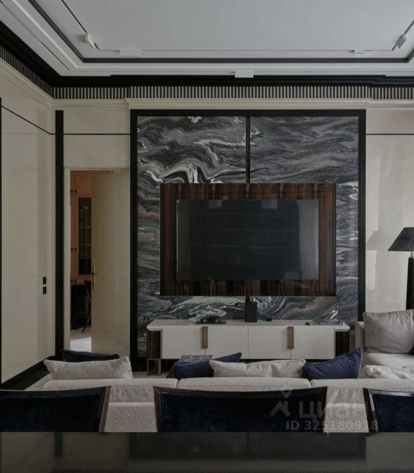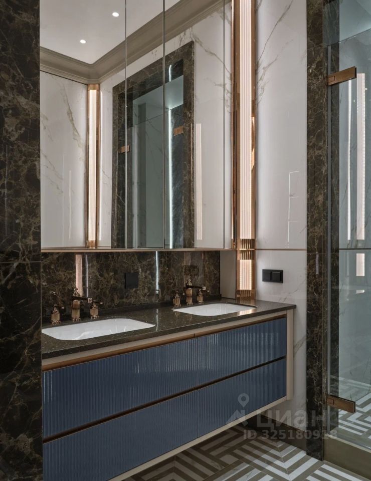 Апартаменты меблированы и декорированы в премиальном современном стиле с элементами неоклассики. В отделке использованы натуральные материалы: камень с выразительной текстурой, шпон ценных пород дерева, латунные и графитовые акценты. Интерьер выполнен в спокойной, благородной палитре — актуален вне времени.